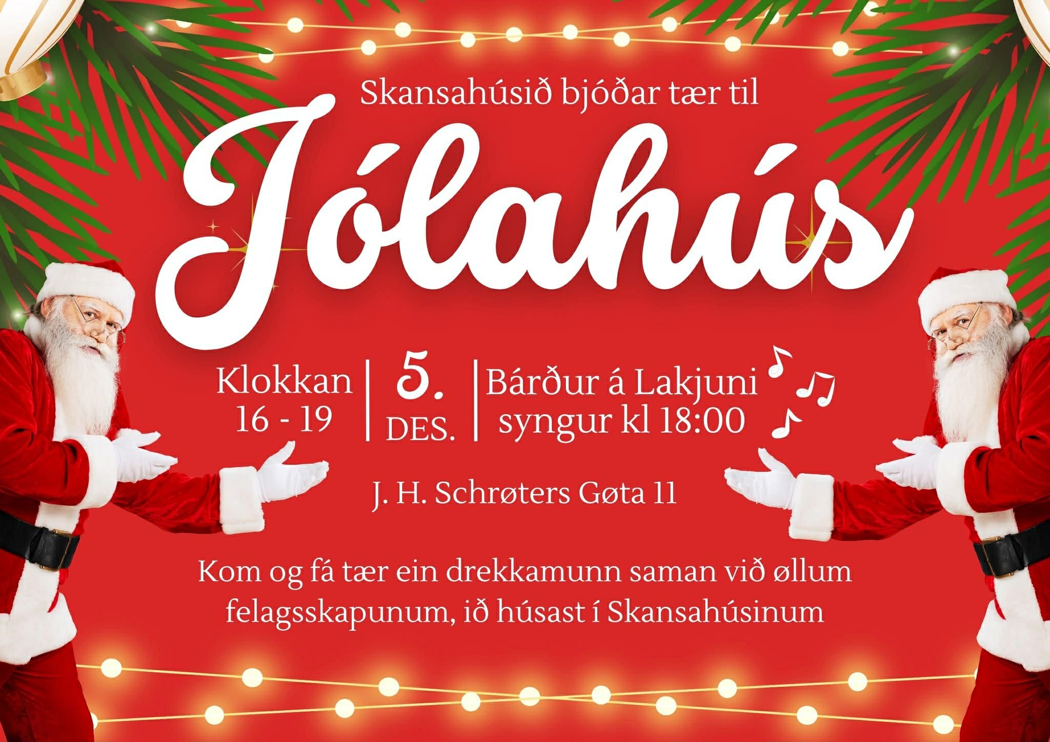 Fríggjadagin, 5. desembur, verður jólahús í Skansahúsinum á J.H Schrøters Gøtu 11, Tórshavn frá kl. 16 til 19, har øll eru vælkomin til ein góðan drekkamunn. Umboð fyri missións felagsskapirnar vera á staðnum og Bárður á Lakjuni, kemur at syngja kl.18.00