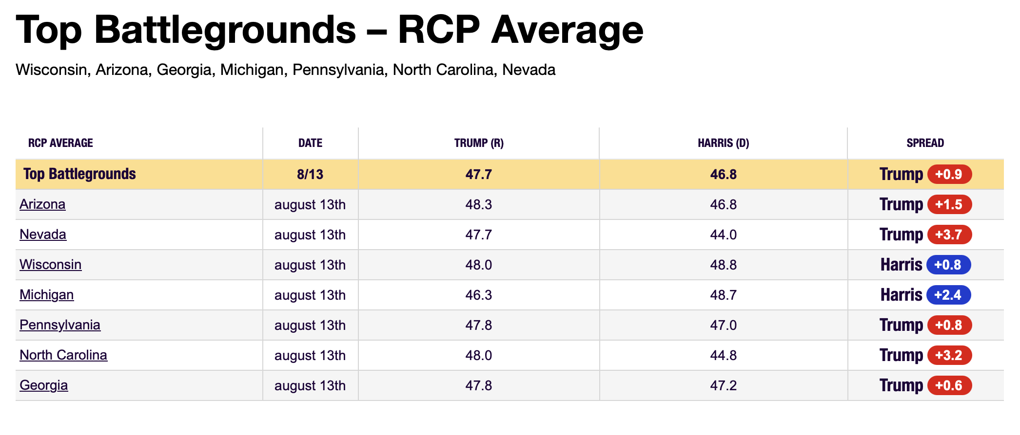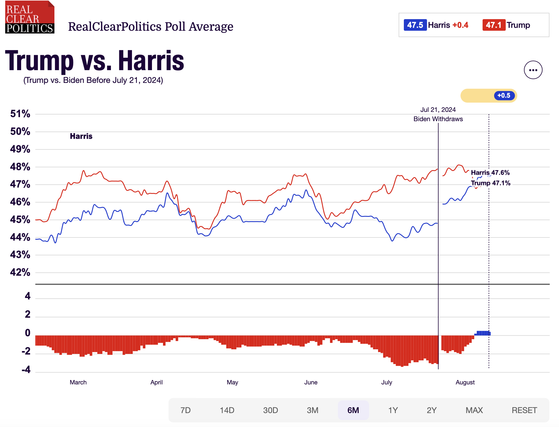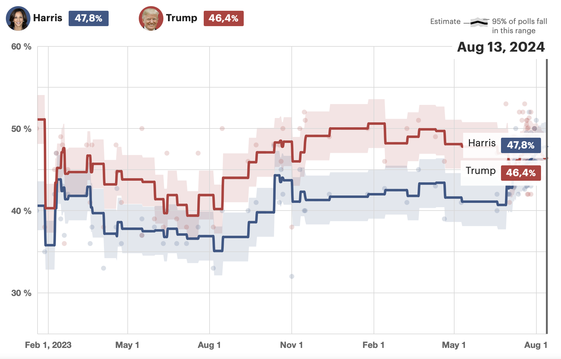 Sambært RealClearPolitics er Harris 0,4% frammanfyri Trump, og hevði fingið 47,5% av atkvøðunum, meðan Trump hevði fingið 47,1%. Tá Joe Biden enn var forsetavalevnið hjá demokratunum, so stóð hann seg munandi verri. 4. juli í ár vóru 3,1% á muni millum Biden (44,0%) og Trump (47,1%), men seinastu seks vikurnar er tann munurin altso horvin, og nú eru tað demokratarnir, sum hava fyrimun.