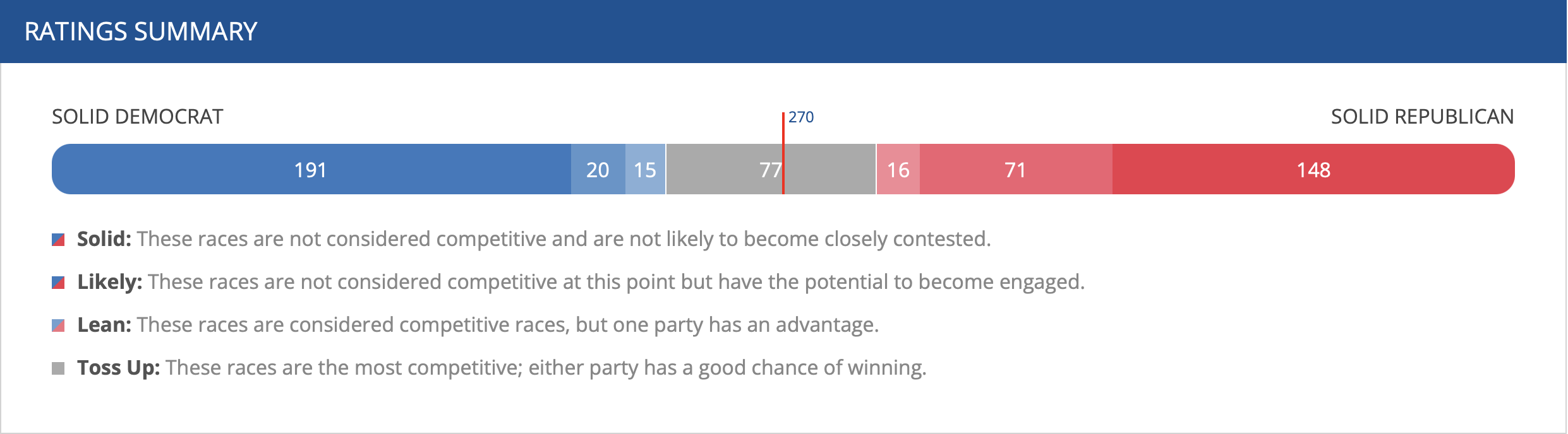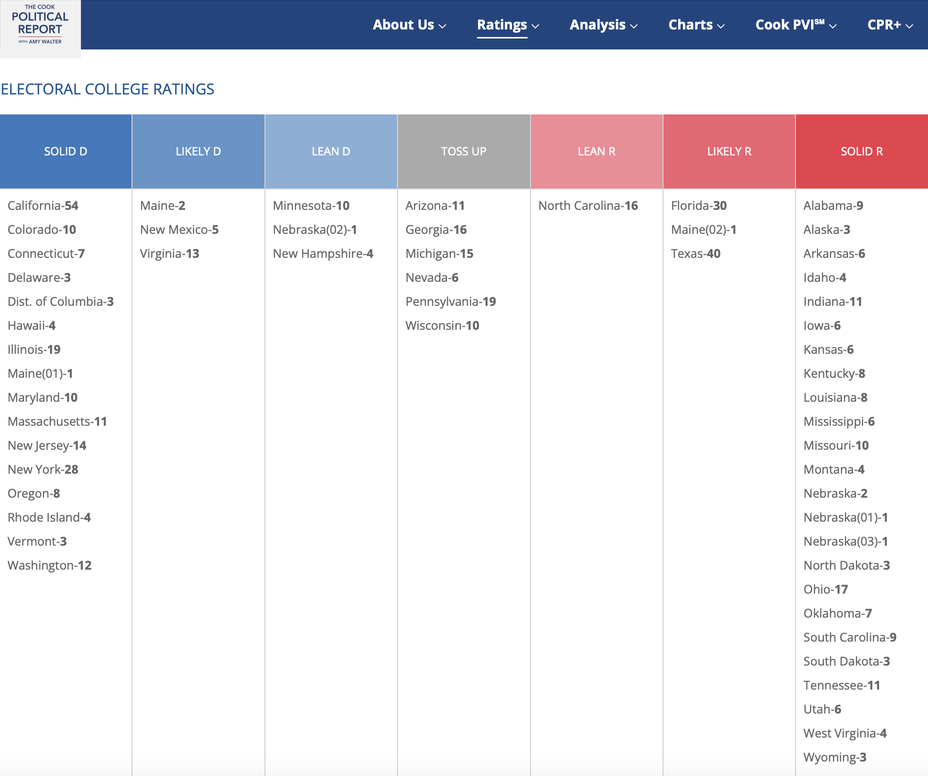 Sambært RealClearPolitics, ið rópar sveigstatirnar fyri 'battleground states' (og sum eisini roknar North Carolina sum sveigstat) hevur Trump ein fyrimun í fimm út av sjey statum.