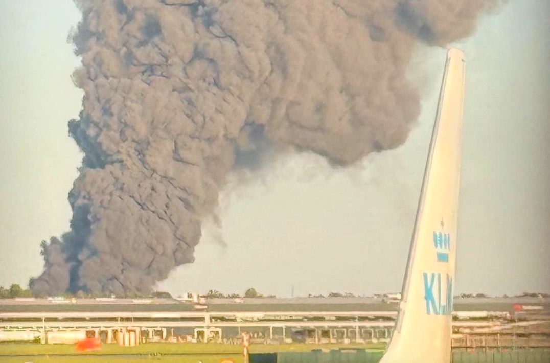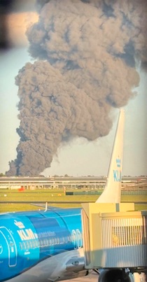 Roykurin, sum stendur himmalhøgt, sæst væl úr floghavnini, og sløkkiliðsfólk royna at fáa tamarhald á støðuni.