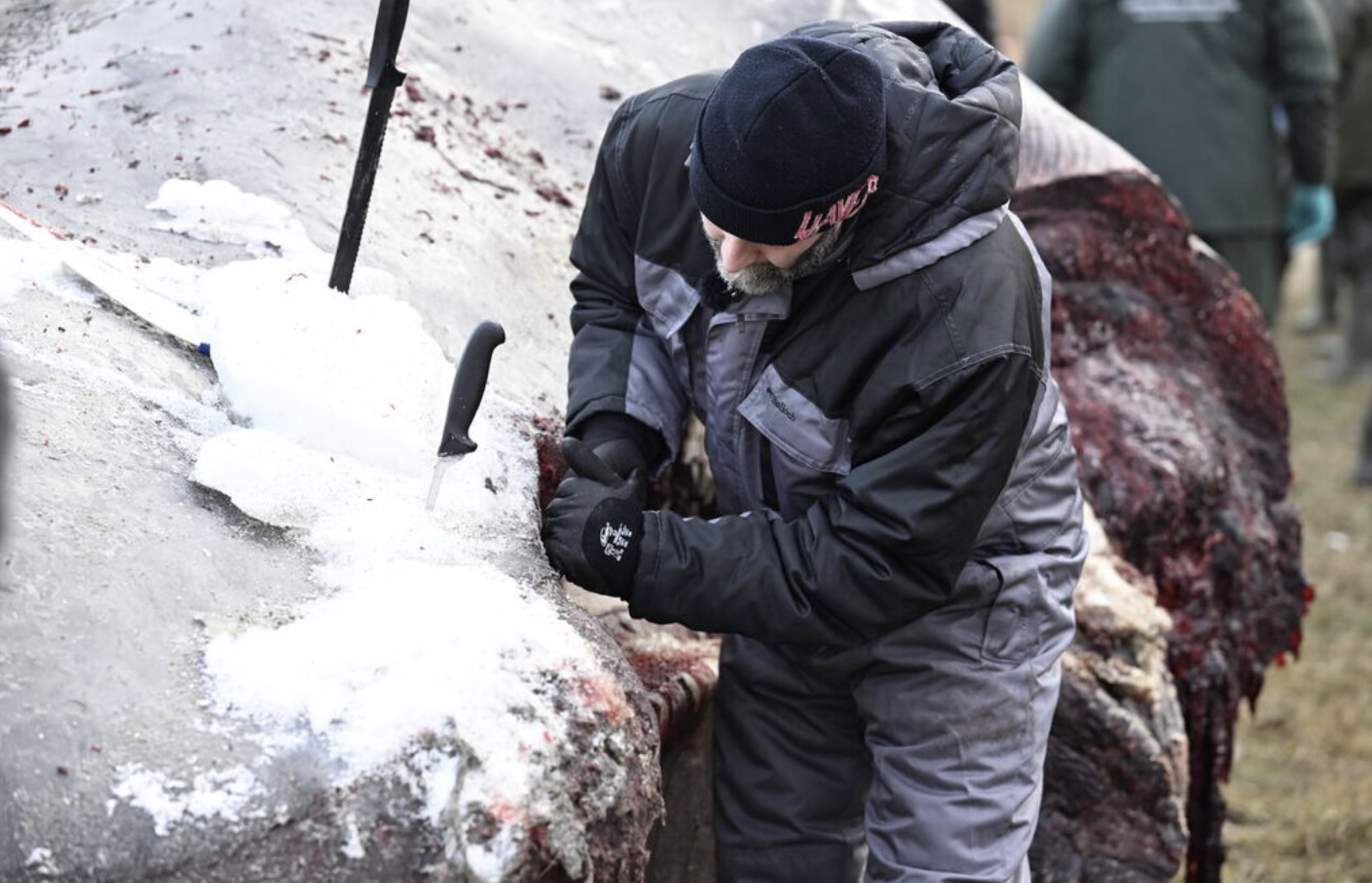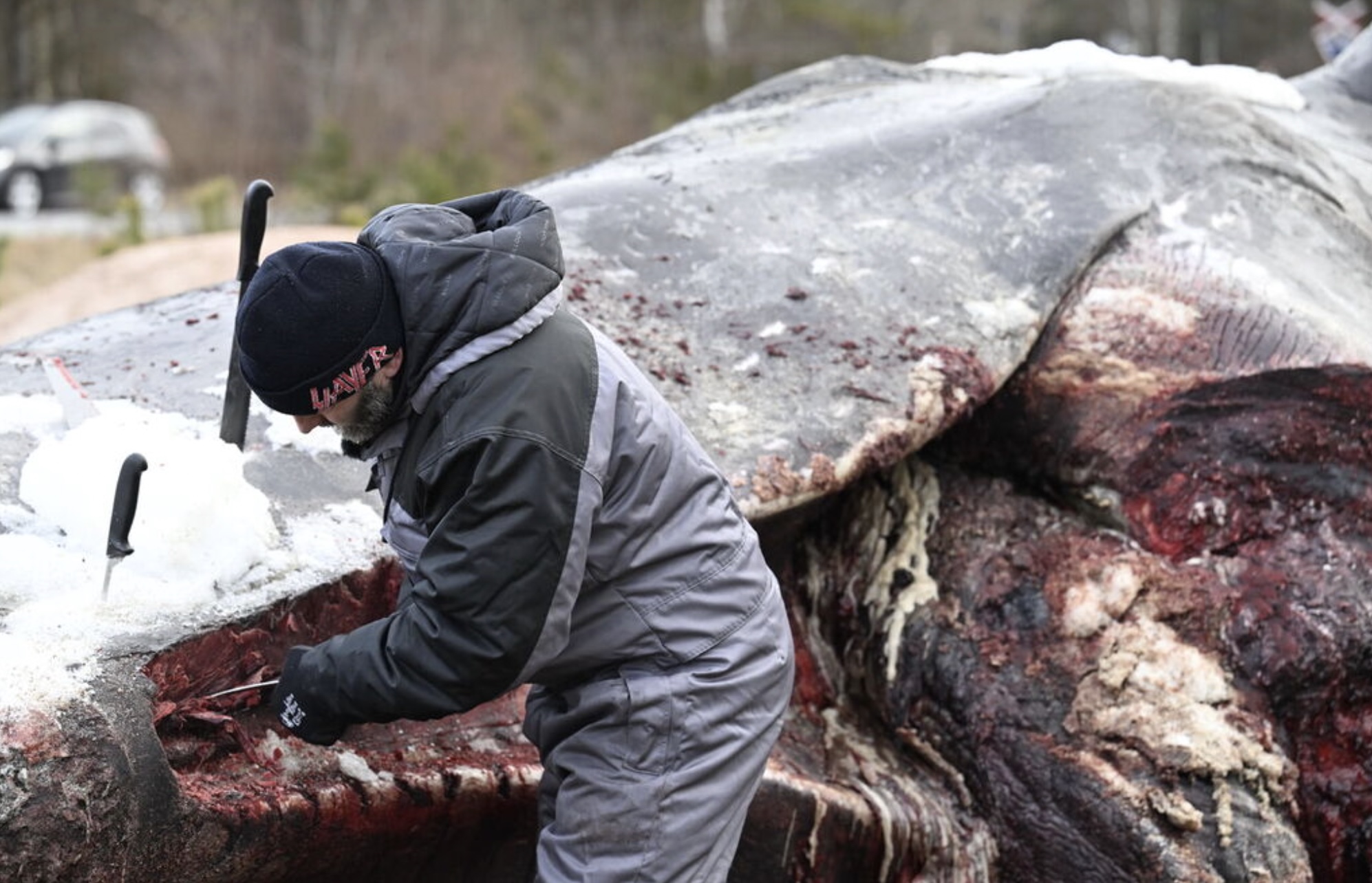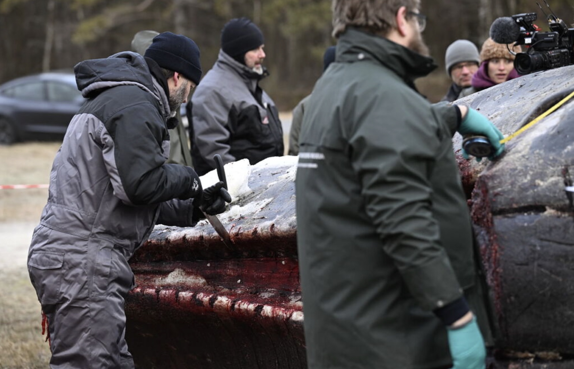 Enn er vandi fyri spreinging, og tí er toymið byrjað við at brúka rennigravara. Hann fer at skera í hvalin og sleppa gassinum fyri at minka um vandan fyri spreinging, sigur Charlotte Bie Pedersen.