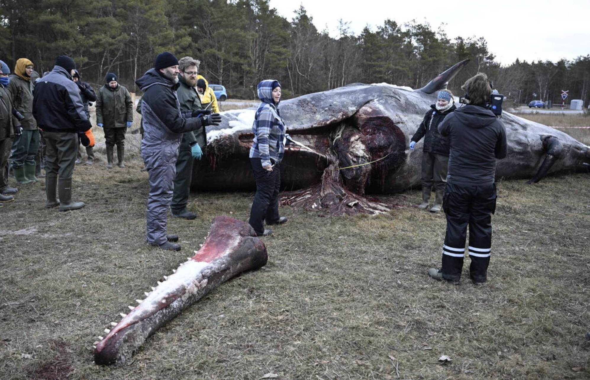 Tilgongdin varð nakað seinkað, men mátingin av hvalinum byrjaði umleið klokkan 9:00, og líkskoðanin er síðani byrjað av álvara.