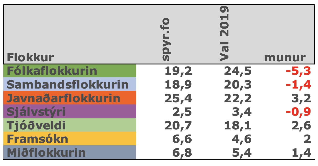 Nýggj veljarakanning hjá spyr.fo, sum er kunngjørd í Blaðnum hjá portal.fo er eitt sindur javnari enn undanfarnu kanningar. Fólkaflokkurin stendur seg munandi betri enn í seinastu kanning, hóast hann framvegis hevur stóra afturgongd. Í mun til seinasta løgtingsval gongur Fólkaflokkurin 5,3 prosentstig aftur.