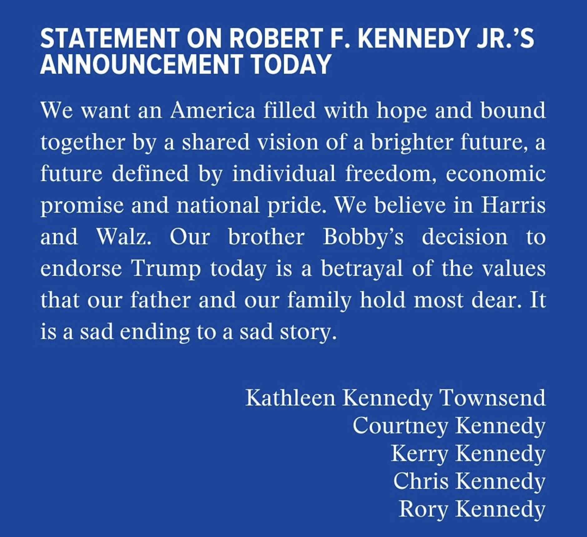 Tað er undirskrivað av Kathleen Kennedy Townsend, Courtney Kennedy, Kerry Kennedy, Chris Kennedy og Rory Kennedy.