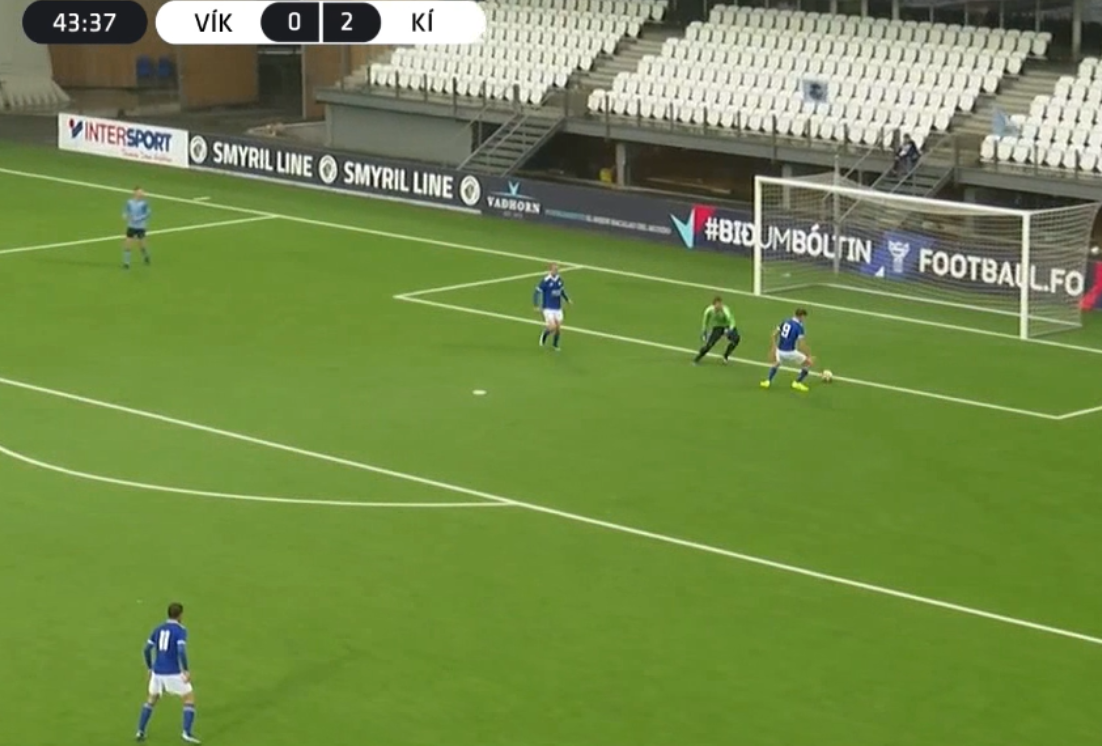 Í fyrra hálvleiki var tað ikki so stórur munur. Tá skoraði KÍ eitt mál. Tað var eftir uppspæl í vinstru og innlegg, at bólturin varð sparkaður fram. Einar 23 metrar úr málinum smekkaði Dávid B. Andreasen til, og bólturin streyk dygst inn við stólpanum og í málið.