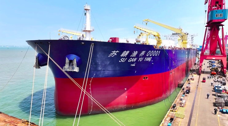 Eitt skip á 130.000 tons - Suhai no. 1 - er sjósett í Kina, og hetta er eitt skip, sum skal ala laks í Gulahavinum.