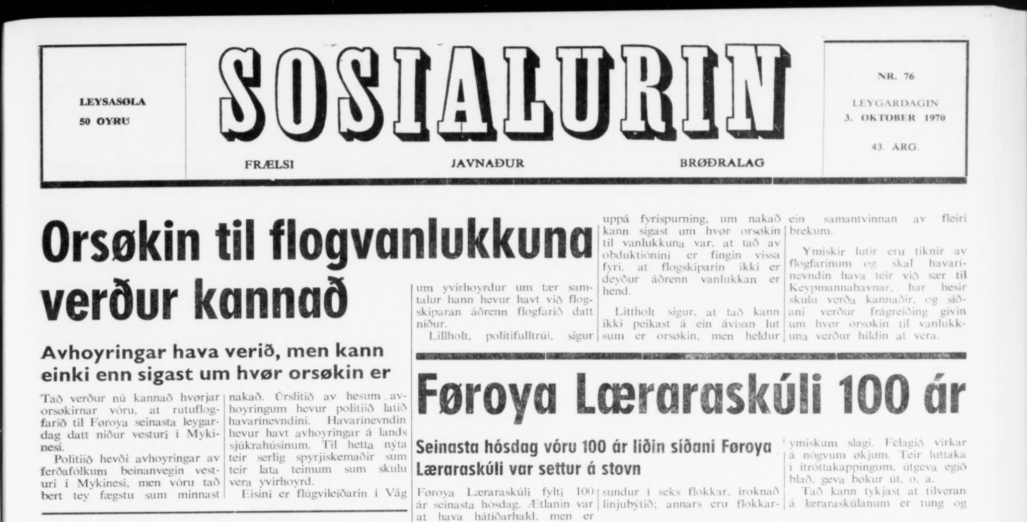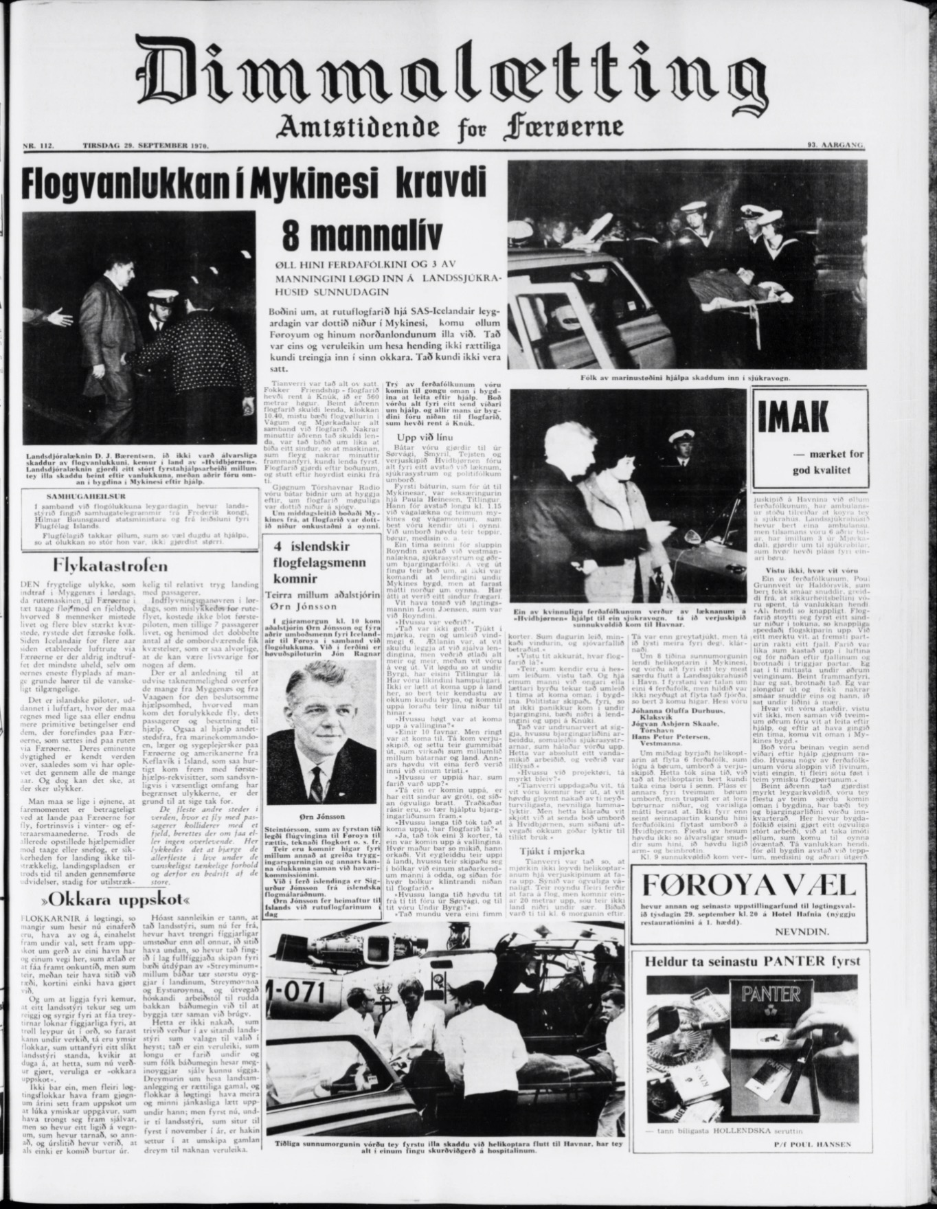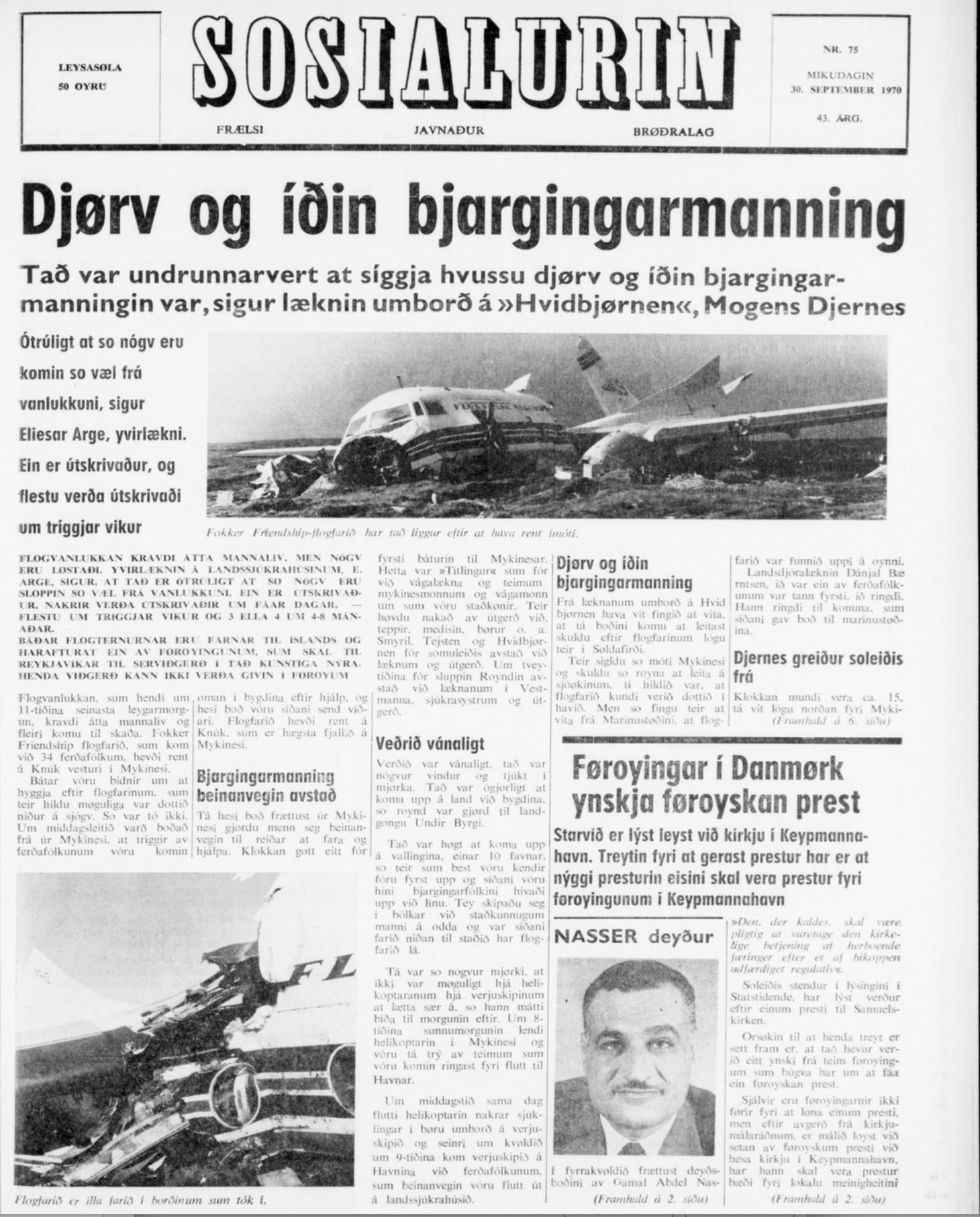 Vit vóru teirra millum, sum stóðu í komuhøllini á flogvøllinum 26. september 1970. Vit bíðaðu eftir flogfarinum, sum verfaðir skuldi við. Tá ljóðaði í hátalaranum: “Flogfarið kemur ikki!” Hetta var jú vanligt, men tað løgna var, at øll vórðu boðin at eta døgurða. Eg spurdi, um hetta veruliga var galdandi fyri okkum, sum ikki skuldu fara avstað, og fekk at vita at so var. Vit koyrdu tí til Bíggjar, har vit komu til búgvið borð. Onkur av donsku ferðafólkunum undraðist yvir, at einki var sagt um hvar flogfarið var. Var tað afturfarið til Bergen ella var tað farið til Íslands?