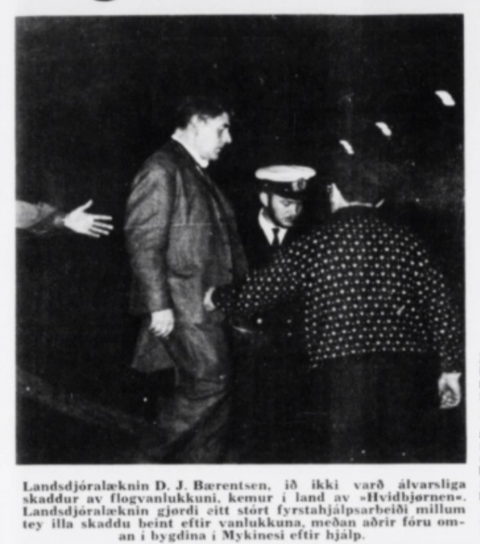 Tá eg hoyrdi um vísindaligu greinina, undraðist eg og vendi mær til teir báðar løgreglumenninar, sum komu til vanlukkustaðið. Reðin Leonsson, sum var 29 ár, kom við báti úr Sørvági og hevði við sær fleiri mykinesmenn, sum vóru vandir fjallmenn. Brim var á lendingini í bygdini, so teir noyddust at koma upp á land norðanfyri, á Byrgi í Kálvadali, og gingu upp á Knúk. Seinnapartin kom hin løgreglumaðurin Fríðmundur Hermansson, sum var 40 ár.