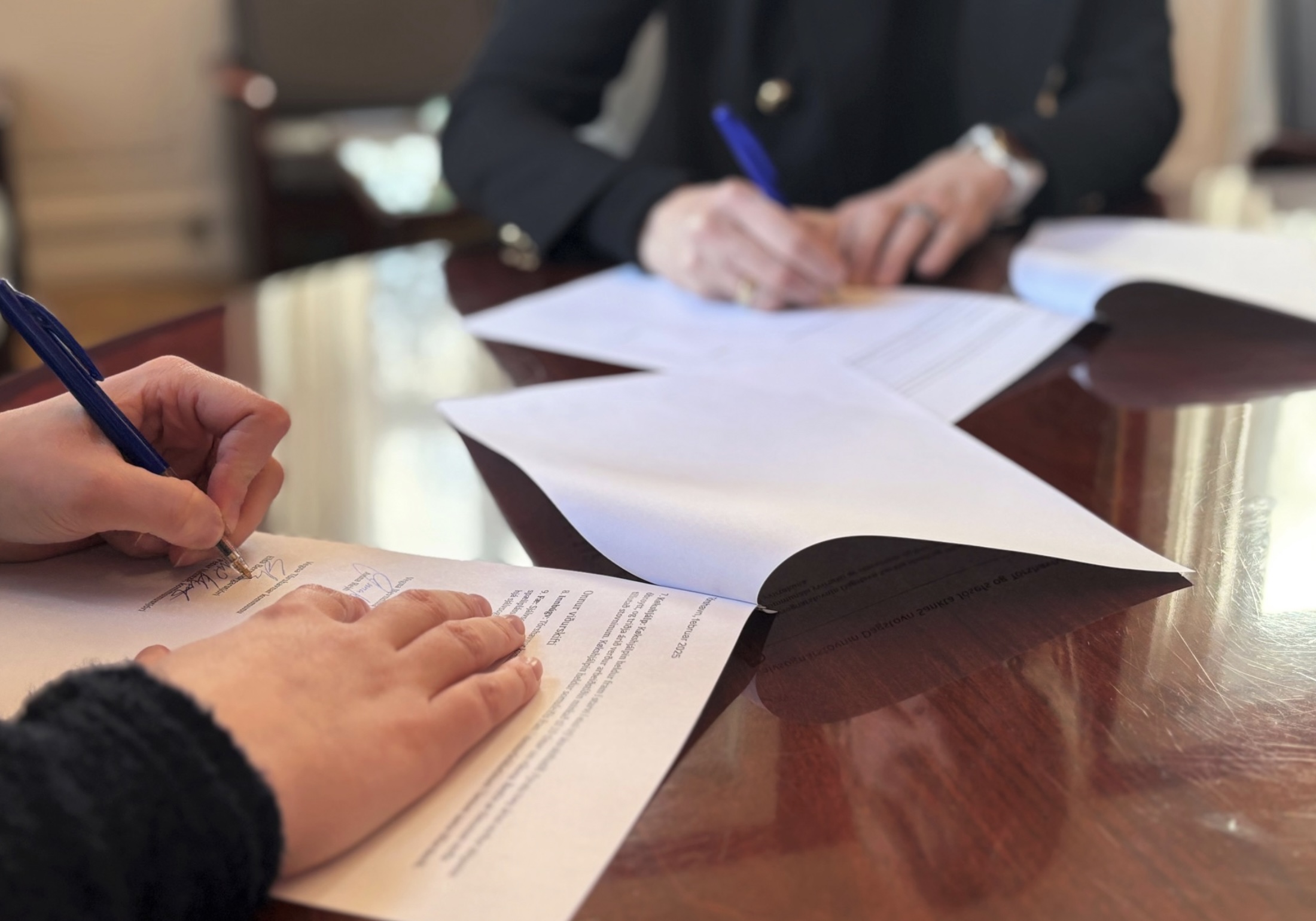 Jóan Petur Hentze, kommunustjóri, Anna Rein vegna sjálvsognarstovnin Dagstovn Sankta Jósefs og Elsa Berg, borgarstjóri, skrivaðu undir.