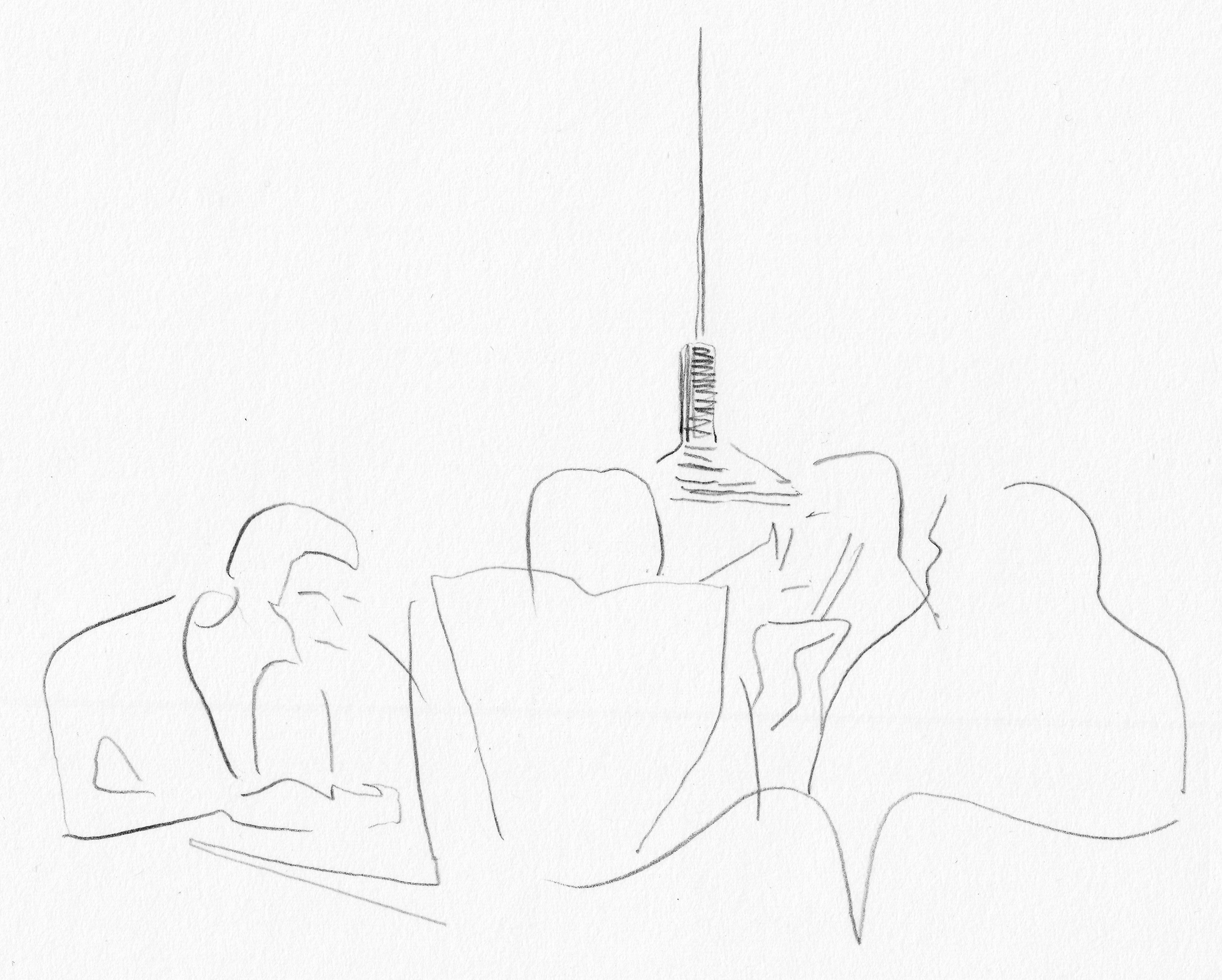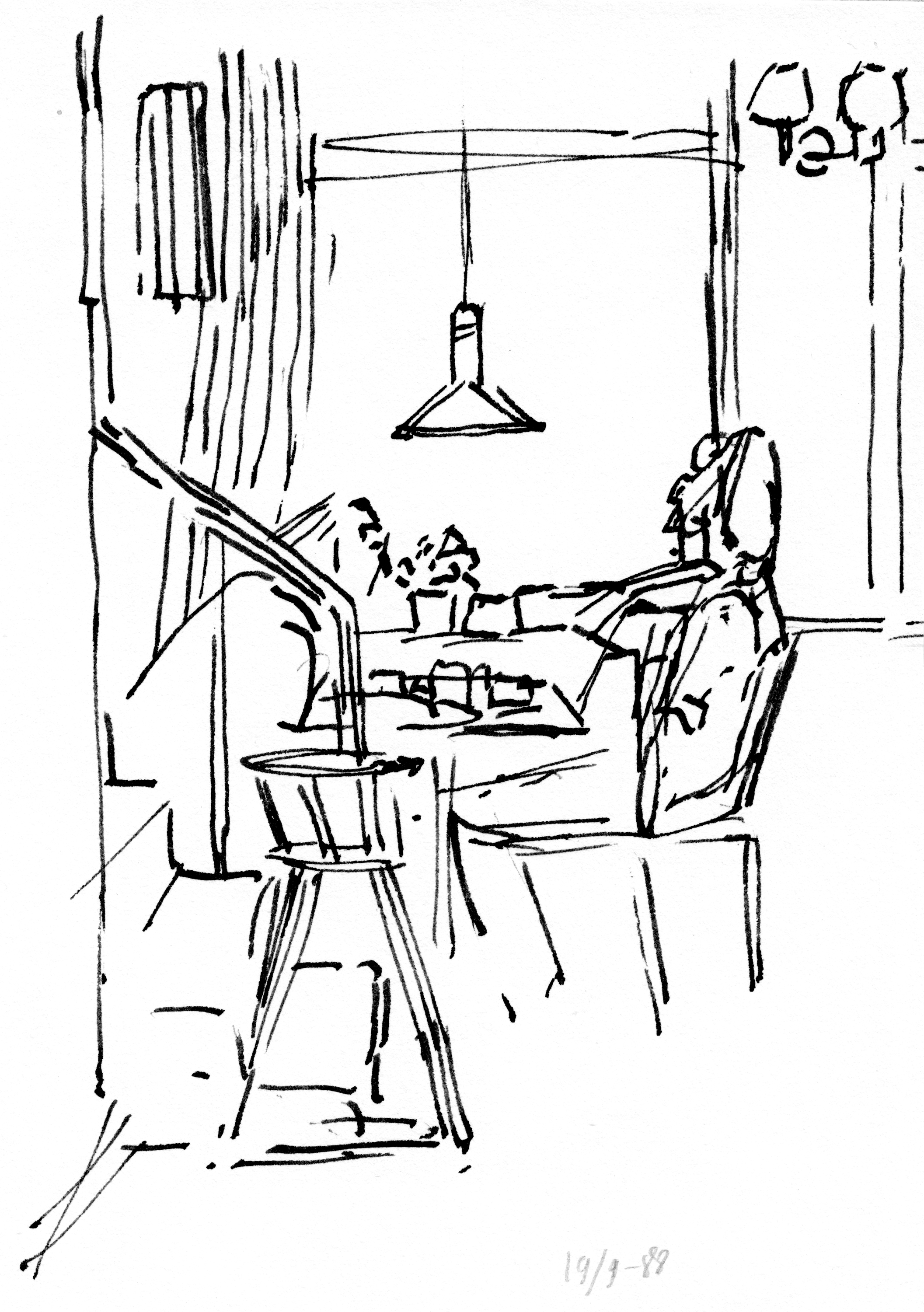 Javnan tók listamaðurin skitsublokkin fram og teknaði fólk, sum ikki bara komu og fóru, men eisini settu seg at kjakast við aðrar kaffistovugestir um lívsins djúpu viðurskifti. Á borðinum kundi standa eplasalat við heitum frikadellum, skálir við mandlurísi og kirsuberjasós og rúkandi heitt kaffi úr Restorffs-koppunum.