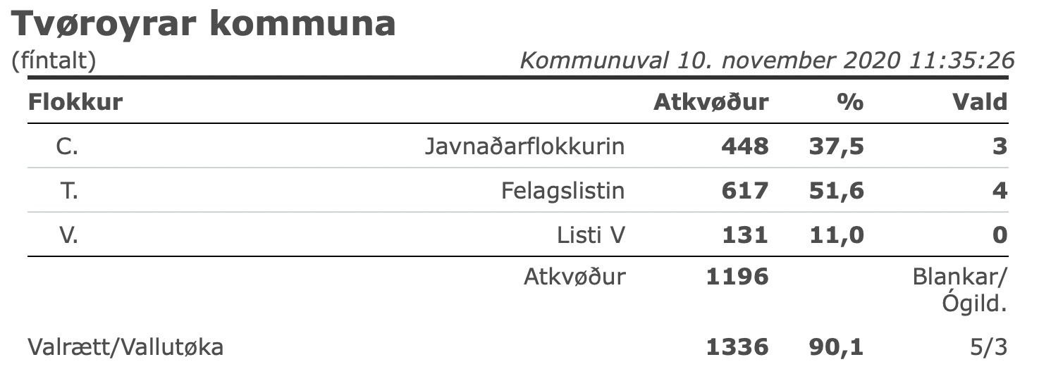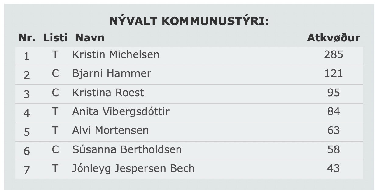Afturat Kristini Michelsen vórðu vald Anita Vibergsdóttir, Alvi Mortensen og Jónleyg Bech vald í býráðið fyri Felagslistan og skipaðu meiriluta.
