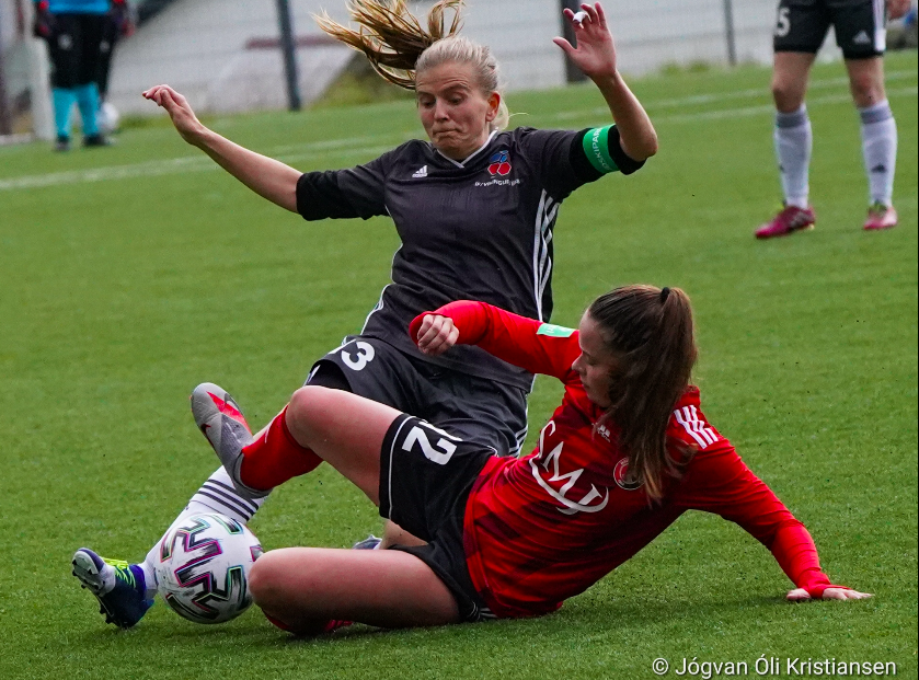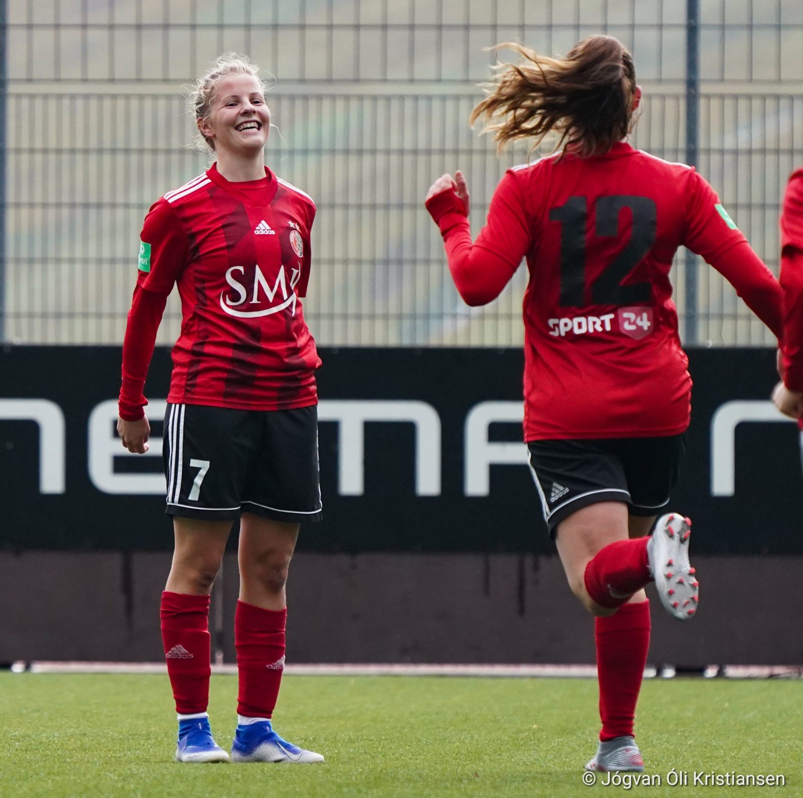 Ístaðin var tað heimaliðið, sum loypti hvøkk á gestirnar seint í fyrra hálvleiki. Eitt miseydnað útspæl frá Óluvu Joensen í KÍ málinum fór beint fyri føturnar á Sáru Magnussen, sum hegnisliga skjeyt bóltin í málið til 1-0, sum eisini var hálvleiksstøðan.