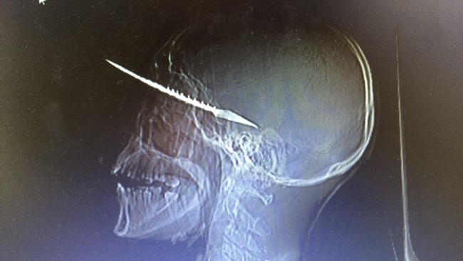 Dag Inge Ulstein slapp eisini at síggja við myndum, hvussu sjúklingar við ógvusligum skaðum í høvdinum, soleiðis sum myndin oman fyri vísir, fingu góða hjálp frá norsku nervaskurðlæknunum.