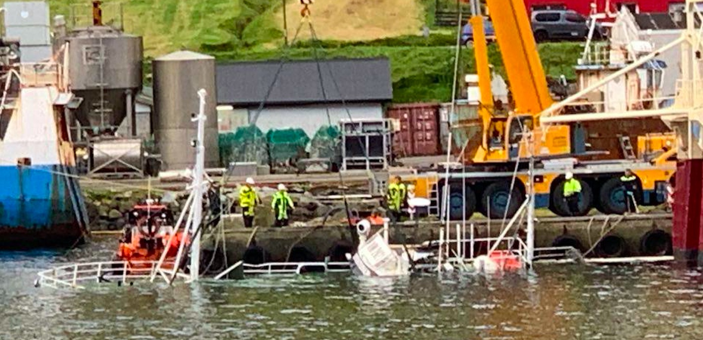 Skipið liggur sokkið niður fyri bryggjuna á Oyri .