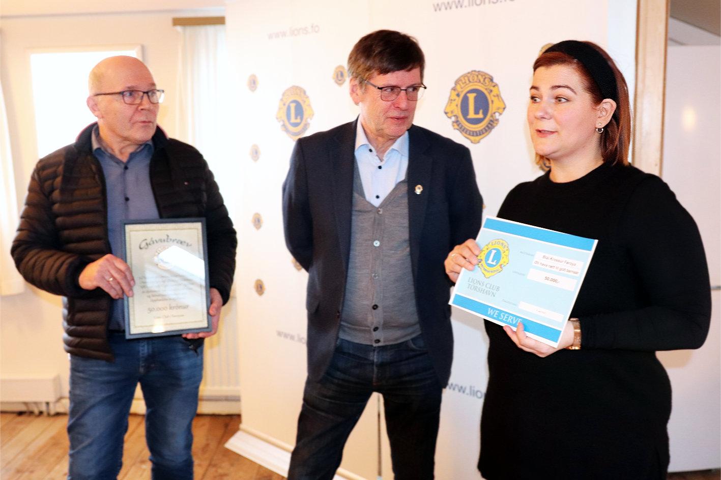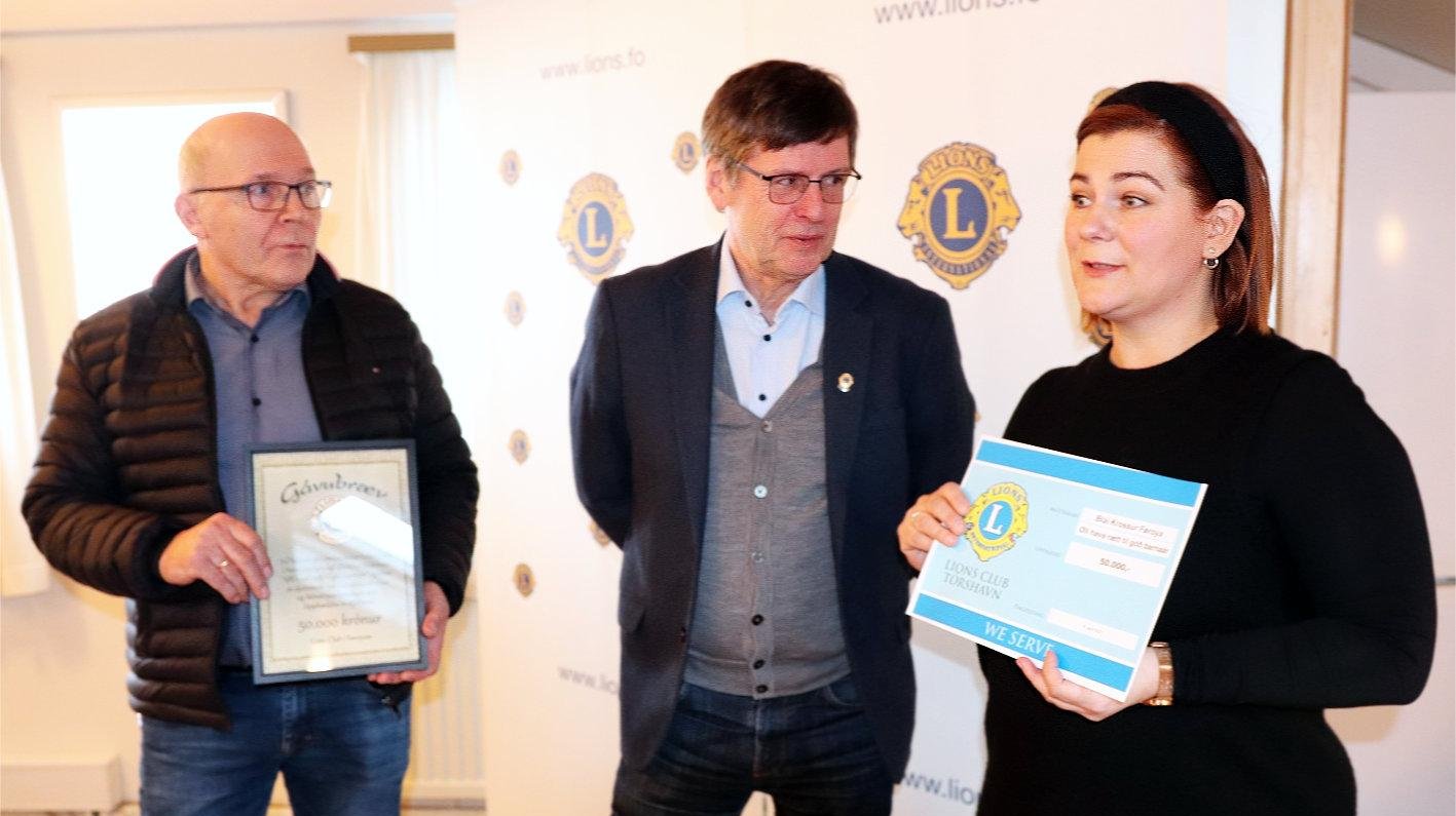 Mortan Poulsen, økisformaður í Lions Club í Føroyum, handaði umboðunum frá Bláa Krossi Føroya, Alisu Hammer og Dakko Petersen, tær 50.000 krónurnar frá stórsteypadystunum í hondbólti og fótbólti
