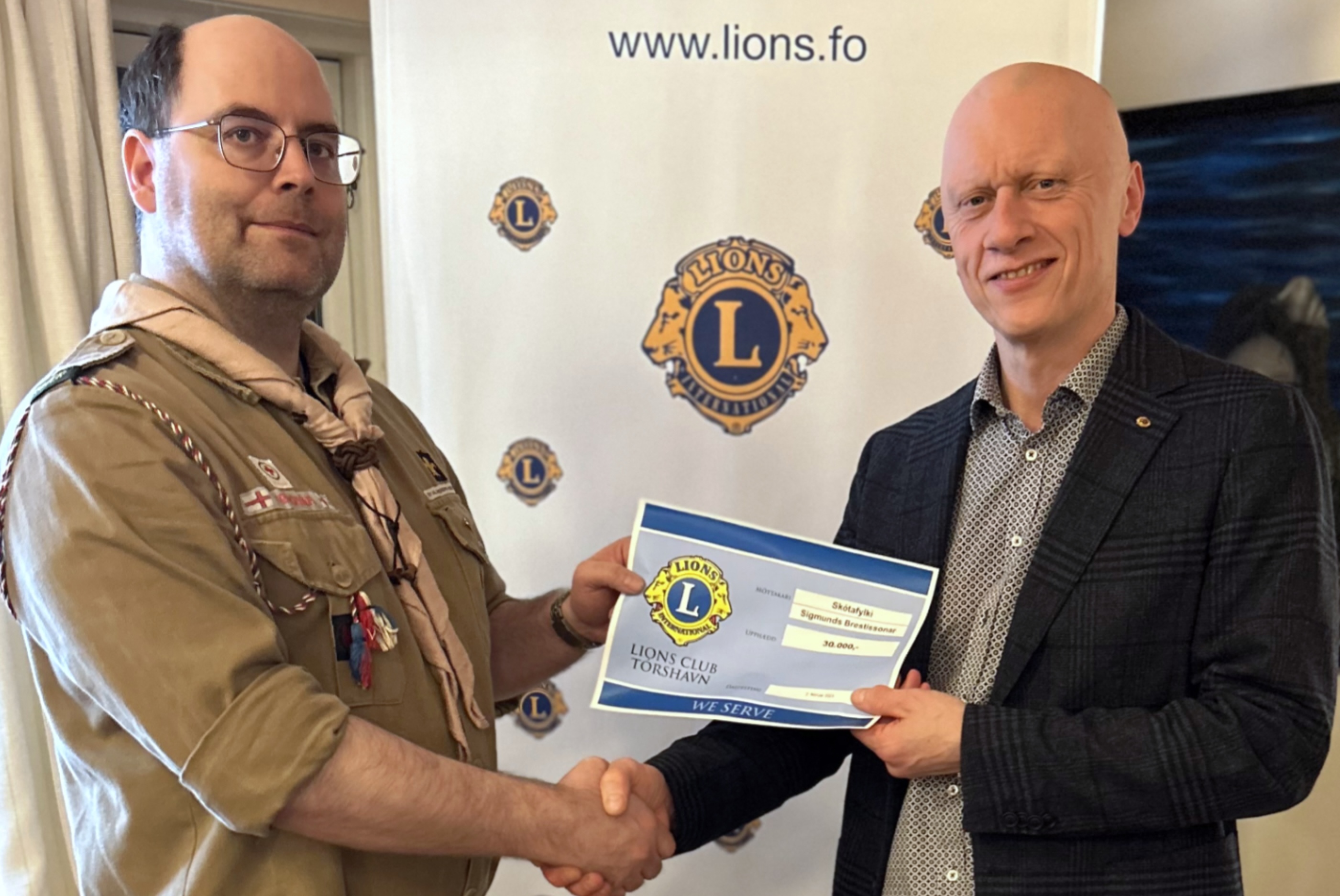 – Tað kemur væl við hjá okkum at fáa 30.000 krónur frá Lions Club Tórshavn, og serliga kemur hetta at gera raksturin hjá okkum munandi lættari, sigur Eirikur Lützen, skótaleiðari í Skótafylki Sigmunds Brestissonar, sum er elsta skótalið í landinum.