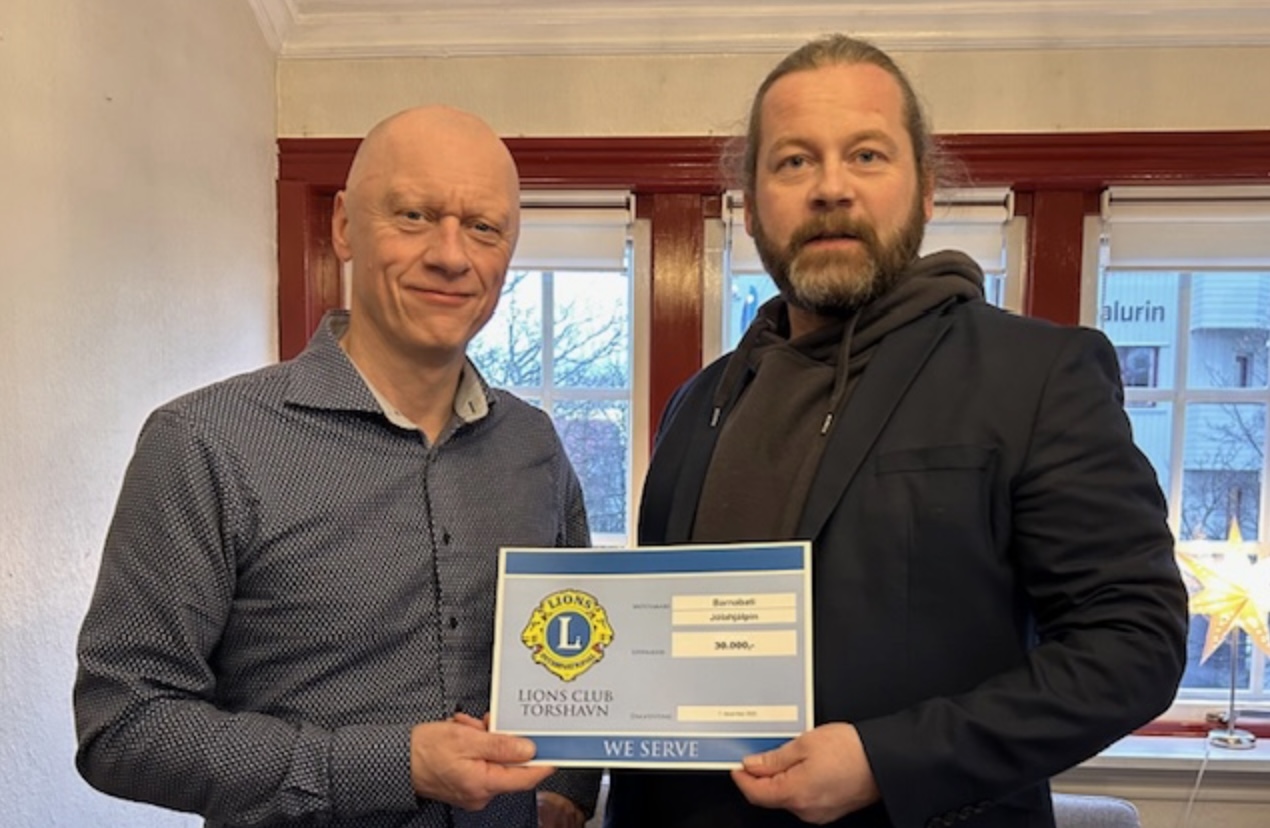 Jóan Petur Hentze, forseti í Lions Club Tórshavn, var á gátt hjá Barnabata, har Djóni Eidesgaard, aðalskrivari, tók ímóti gávubrævi uppá kr. 30.000.