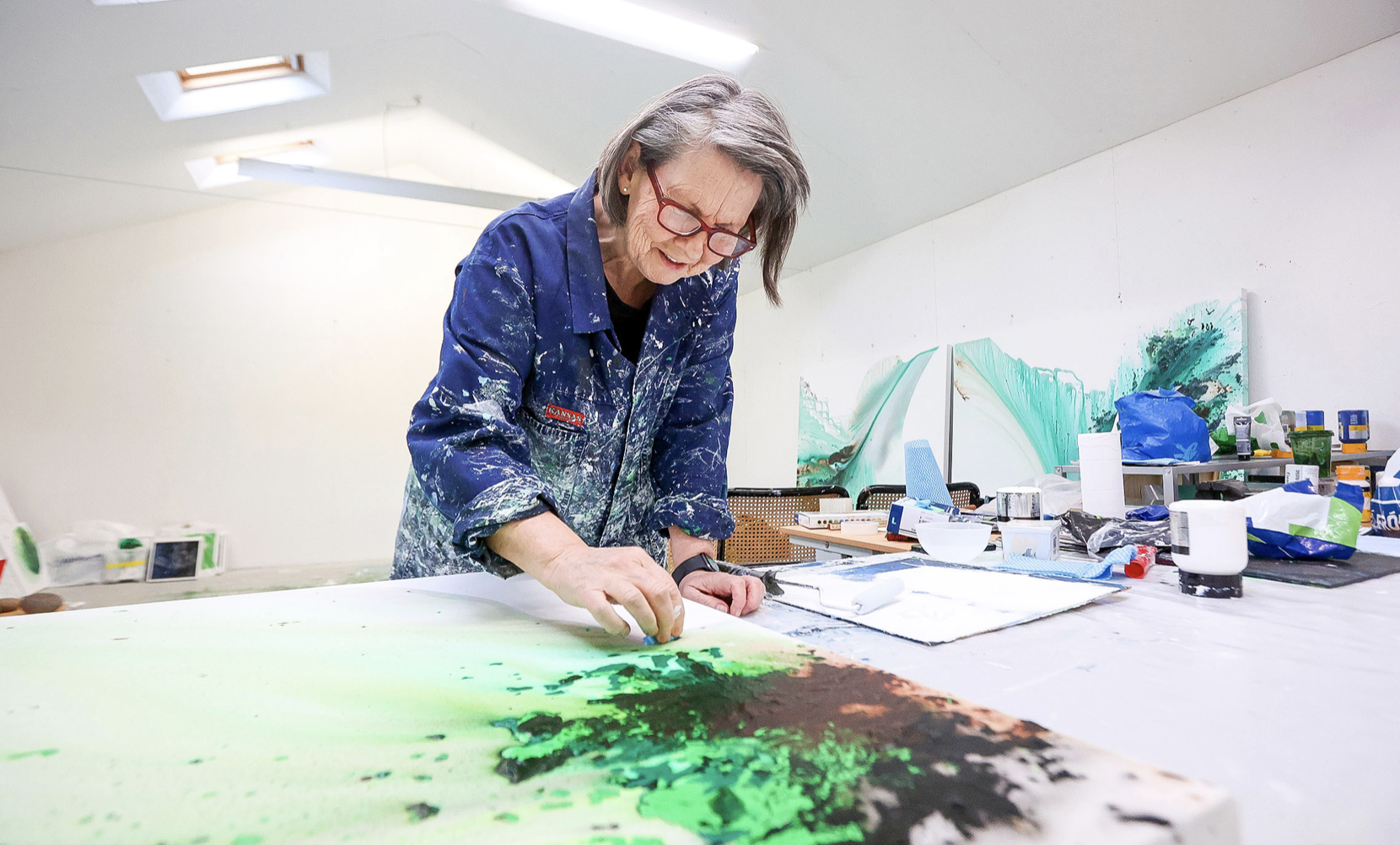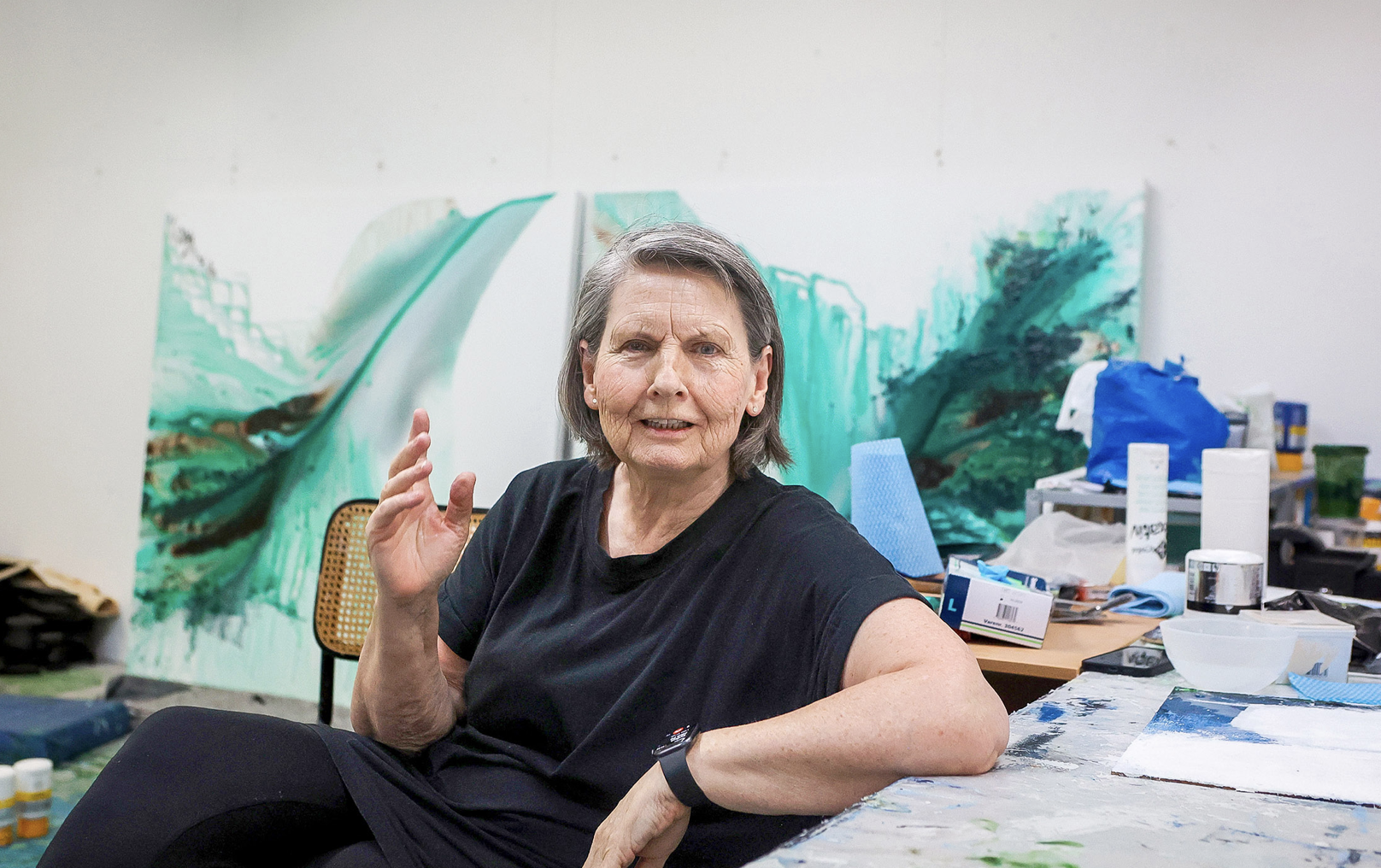 Hon snøggar kantar á motivi á málningi, sum skal sýnast fram í Danmark í apríl. Onnur verk standa upp ímóti veggjunum í atelierinum. Eingin ivi er um, at Astri Luihn hevur málað.