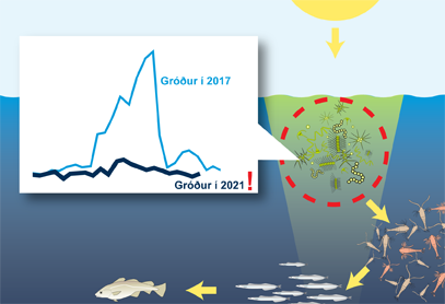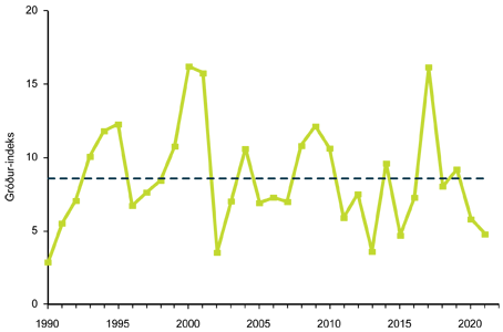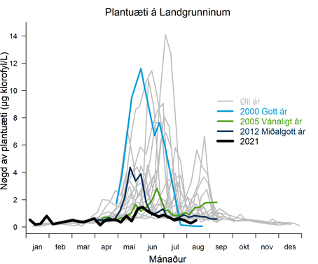 Í ár hevur verið sera lítið at plantuæti á Landgrunninum, og einki tíðarskeið hevur verið við stórum nøgdum (Mynd 1, vikuligar mátingar í Skopunarfirði). Somuleiðis vísa kanningar við Jákup Sverra, at gróðurin á Landgrunninum hevur verið sera lítil í ár (Mynd 2, gróðurindeks á árliga ætikanningartúrinum í juni).