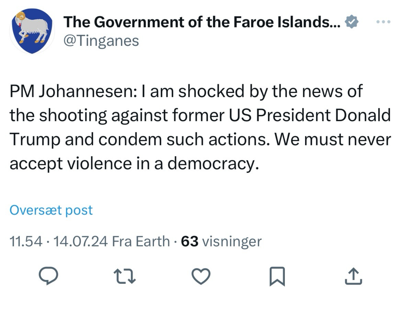 Løgmaður viðmerkir drápsroyndina ímóti Trump á X, sum fyrr var Twitter