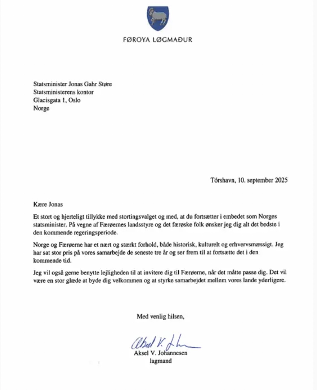 Í brævinum sigur løgmaður millum annað, at Føroyar virðismeta góða sambandið við Noreg og nýtti eisini høvið at bjóða forsætisráðharranum til Føroya.