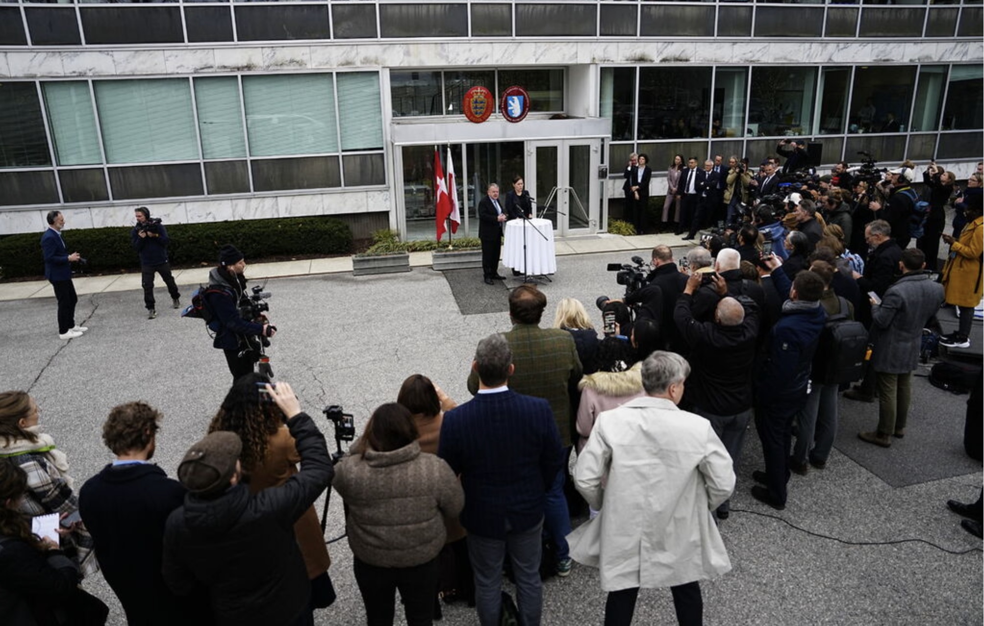 Vivian Motzfeldt tosaði fyrst á grønlendskum, tí nógv fólk sita spent og bíða í Grønlandi, segði hon, og segði so nakað á grønlendskum, sum ikki var týtt til danskt ella enskt.
