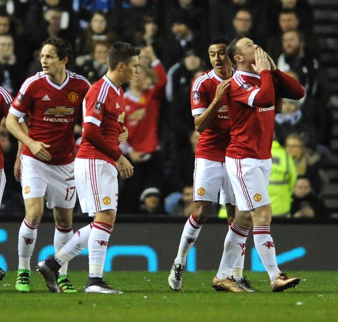 Wayne Rooney legði tíðliga í fyrra hálvleiki United á odda 1-0 við einum frálíkum langskotið. Derby javnaði tó til 1-1 stutt undan hálvleiki George Thorne javnaði.
