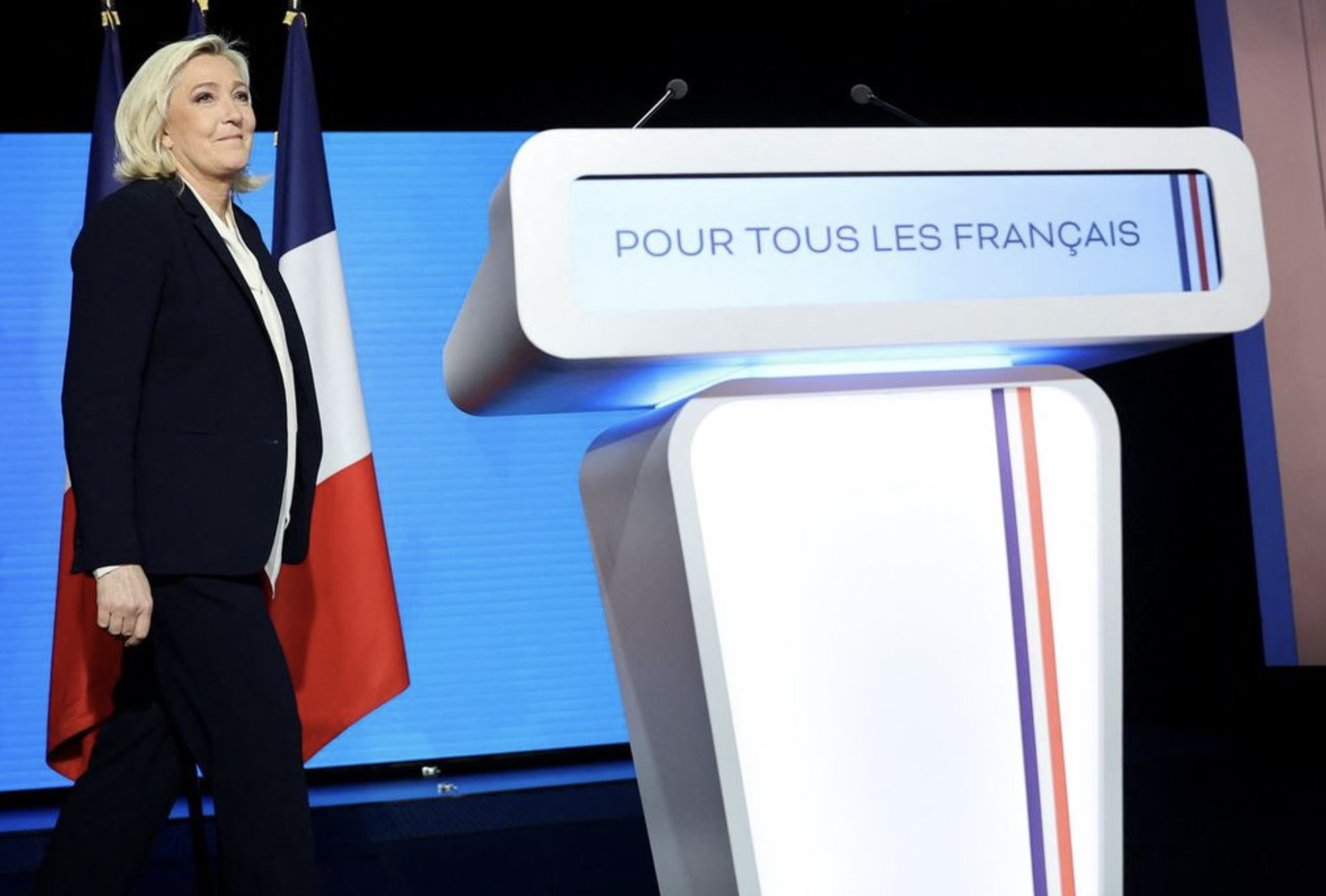 – Eg fari ongantíð at svíkja franska fólki, leggur Le Pen dent á, áðrenn hon og stuðlar hennara sungu franska tjóðsangin, »Marseillaisen«.