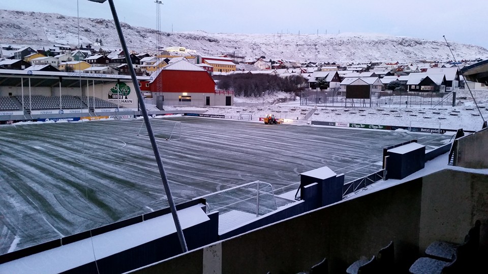 Í dag spældu meistararnir í B36 fyrsta venjingardystin. Í morgun var ovari vøllur í Gundadali heilt hvítur, men kommunan syrgdi fyri, at tað bar til at spæla.