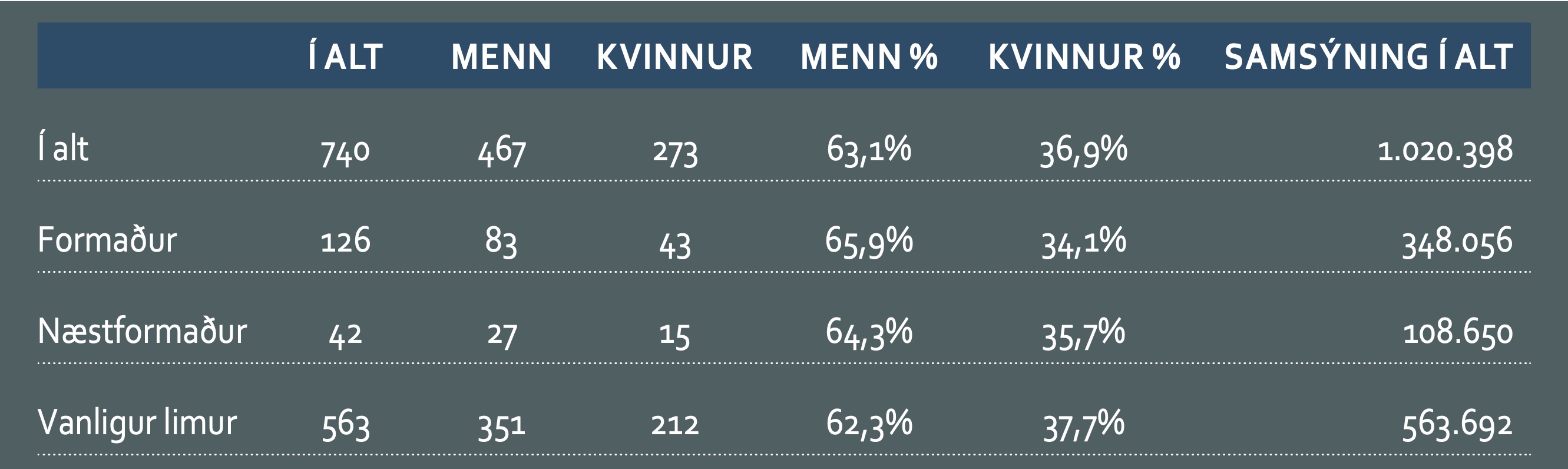 Sum heild vísir kanningin, at yvirhøvur er javnstøða, har sum samsýningin er lágt, men at menn stórliga yvir yvirumboðaðir í teimum best løntu nevndarsessunum.