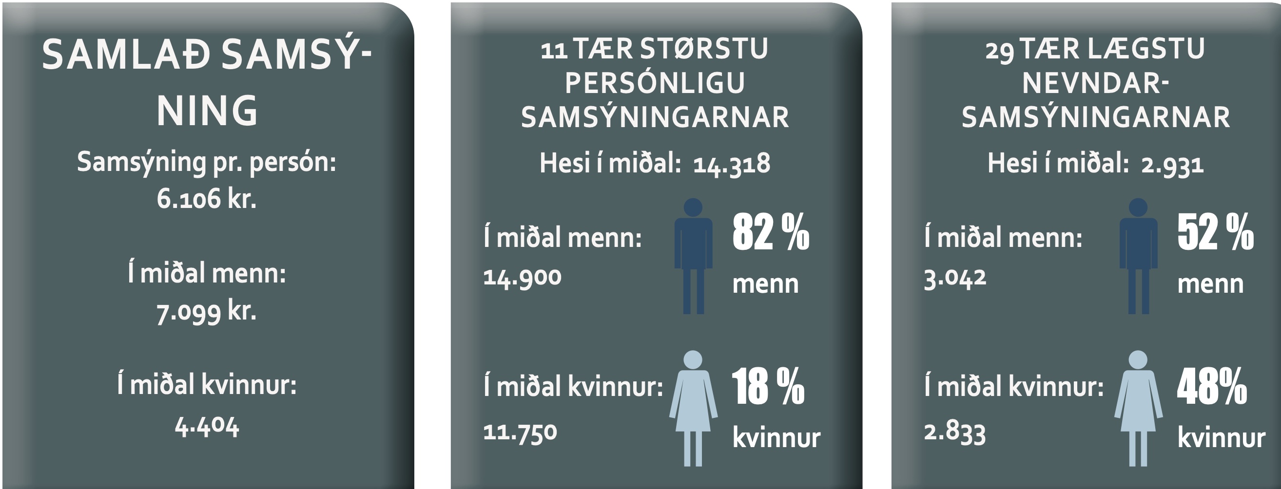Men hyggja vit eftir kynsbýtinum í teimum nevndum, sum geva mest í samsýning, er myndin øðrvísi. Av teimum 11 sessunum, sum geva størsta samsýning, sita menn í teimum níggju, men kvinnur bara sita í tveimum sessum.