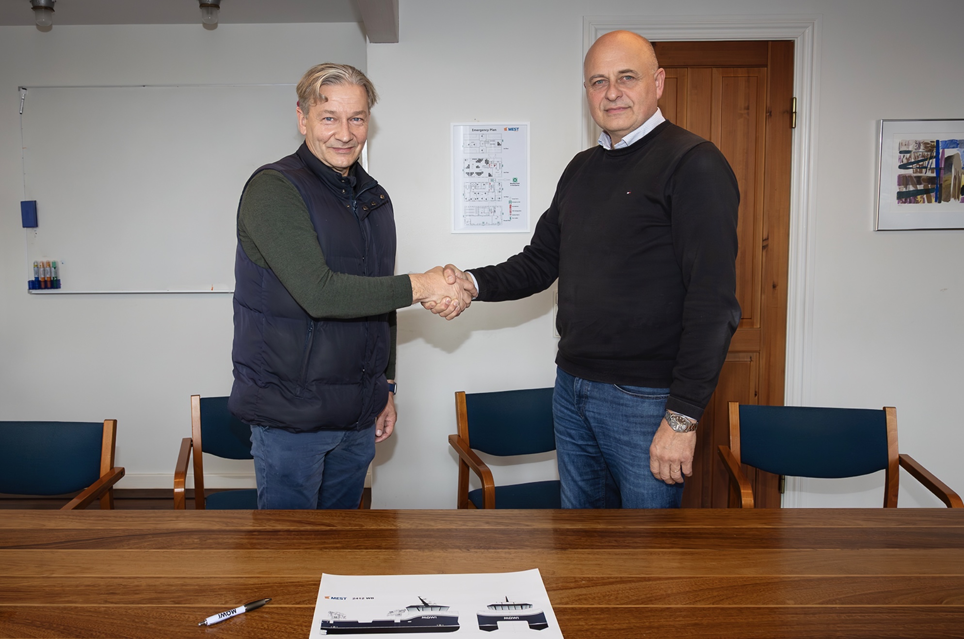 Á myndini eru Hans Jákup Mikkelsen, stjóri á MOWI í Føroyum og Mouritz Mohr, stjóri á MEST, tá sáttmálin var undirskrivaður.