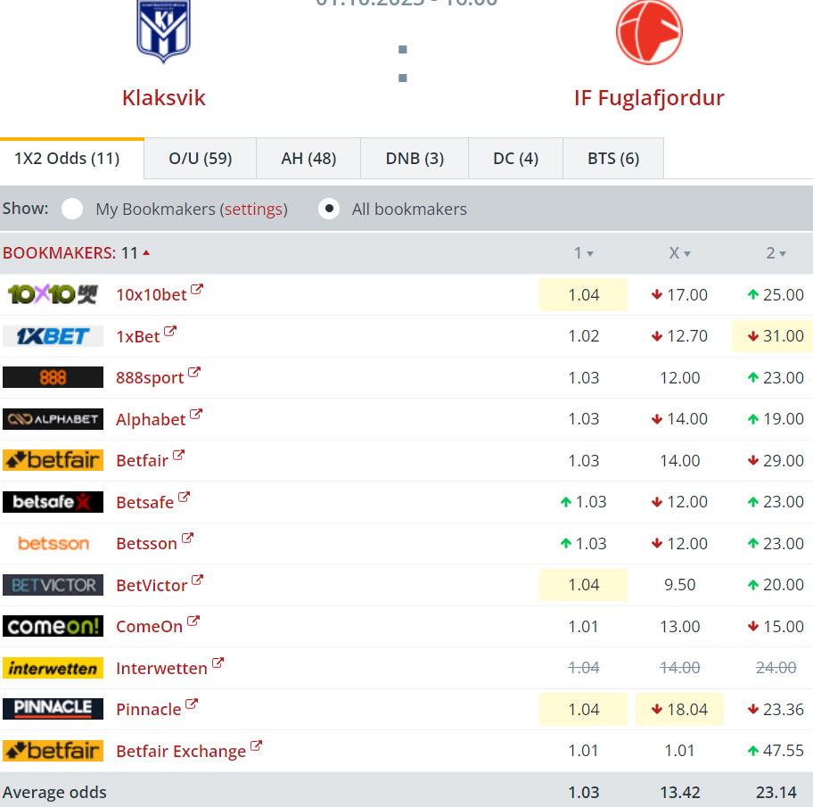 11 altjóða veddingarfyritøkur lata odds upp á dystin millum KÍ og ÍF, og sambært oddsunum hevur ÍF nærum ongan møguleika at vinna á KÍ í morgin.