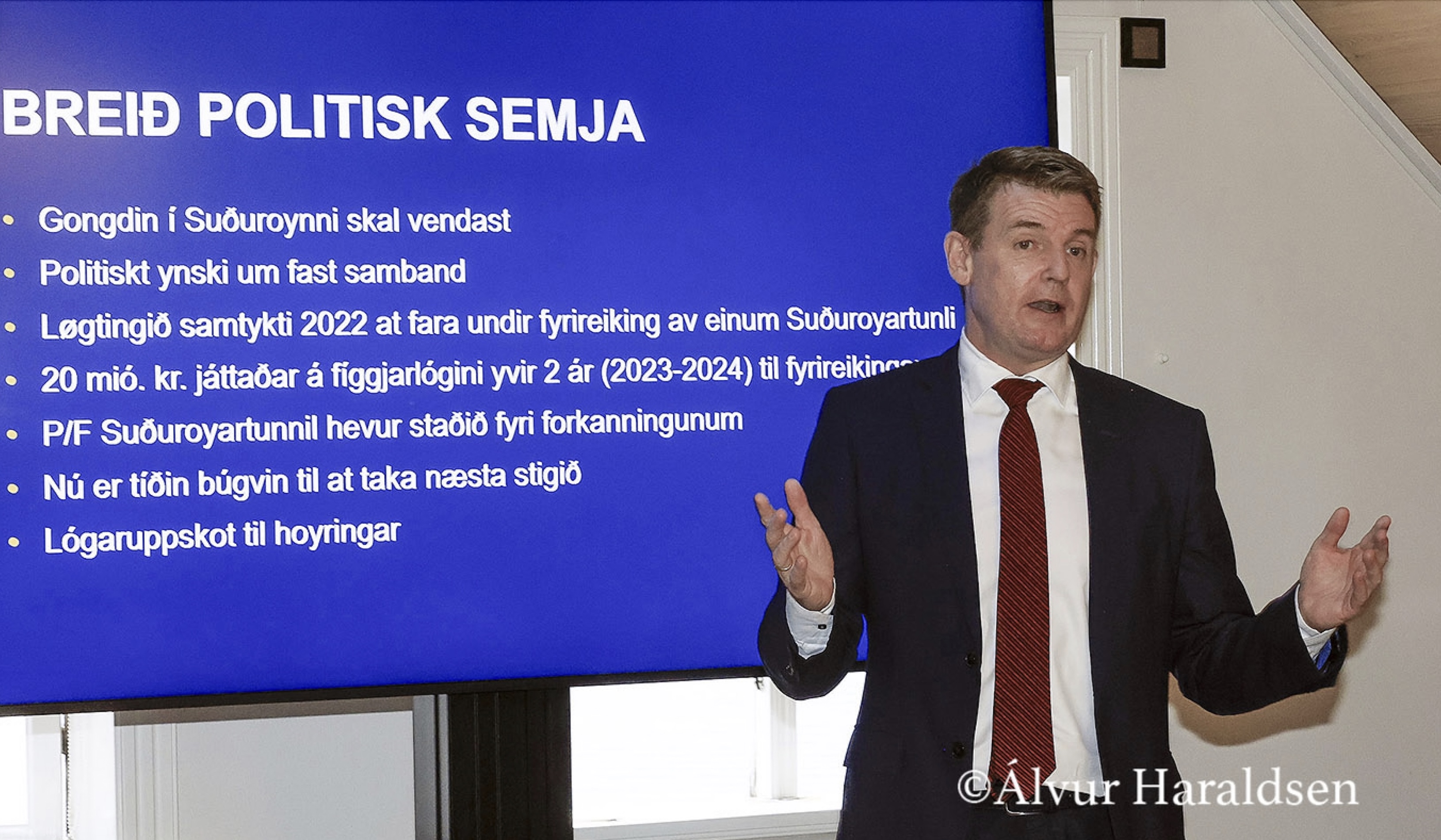 – Spyrjarin vil fegin vita, um KVF livir upp til egnar leiðreglur um fjølmiðlasið og til aðalmálið hjá KVF, tá tað snýr seg um miðlingina av uppskotinum til løgtingslóg um fyrireiking, projektering og útboð av Suðuroyartunlinum við tilhoyrandi tunnilskervum og vegakervum. Tí verða hesir spurningar settir landsstýriskvinnuni.