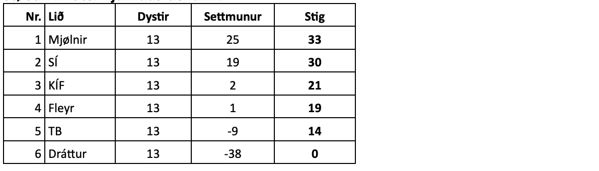 Tey tvey stigini hjá Mjølni eru júst nóg mikið hjá teimum til at varðveita fyrstaplássið í kappingini, hóast tær skuldu tapt 3-0 fyri SÍ í seinasta landskappingardystinum, um Mjølnir væl at merkja vinnur 3-0 á TB í næstsíðsta dystinum. Tí hóast SÍ skuldi vunnið 3-0 á Fleyr í sínum næstsíðsta dysti og síðani 3-0 í seinasta dystinum ímóti Mjølni, so høvdu bæði liðini enda á 36 stigum og settmuninum +25, og tá eru tað innanhýsisdystirnir sum avgera, hvør er fremst, og har hevur Mjølnir vunnið báðar (3-2 og 3-0), og tí verður Mjølnir betur innanhýsis, hóast SÍ vinnur tann seinasta 3-0. Men tapir Mjølnir sett fyri TB fýra dagar frammanundan, so kann SÍ taka fyrstaplássið.