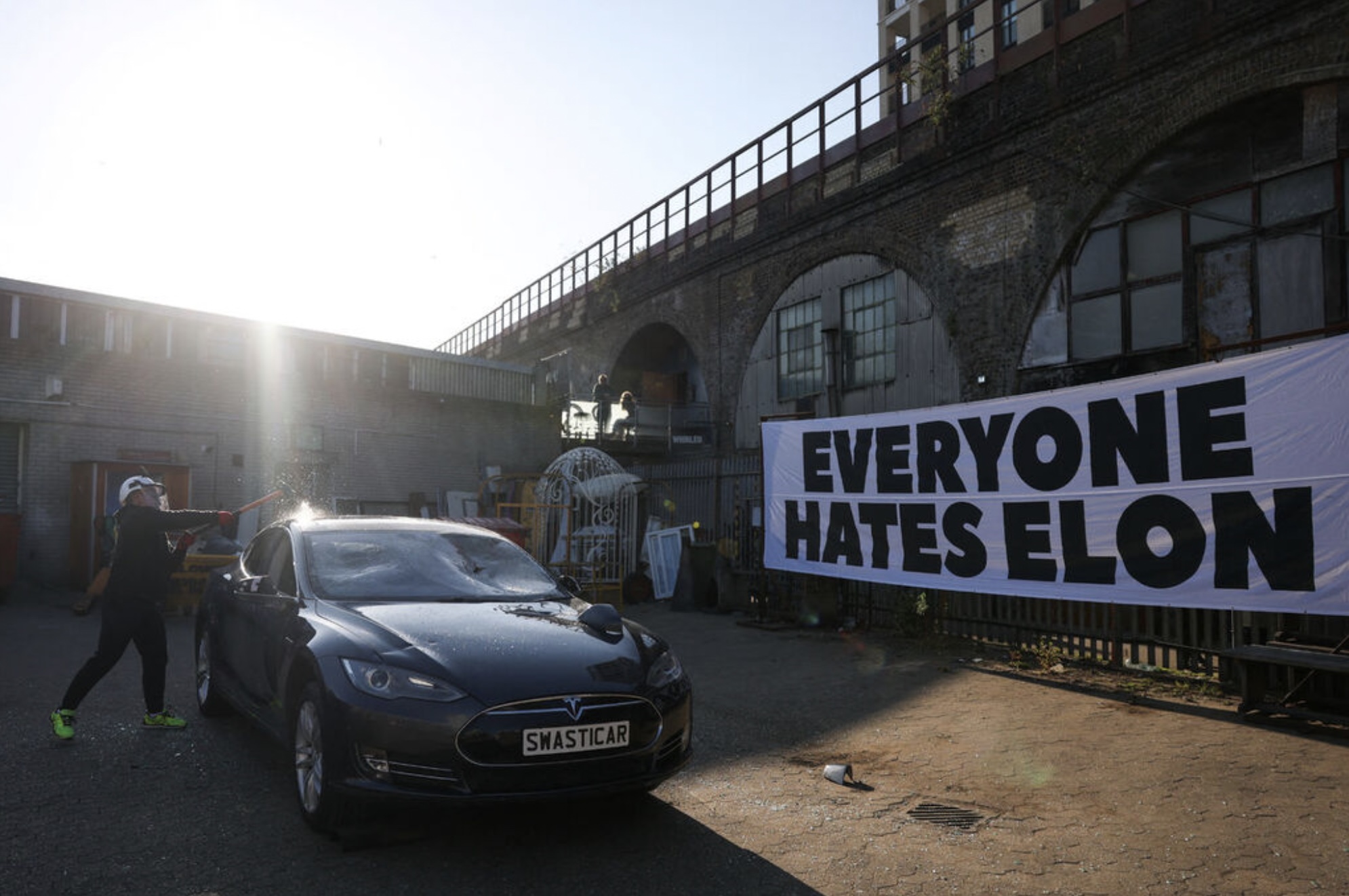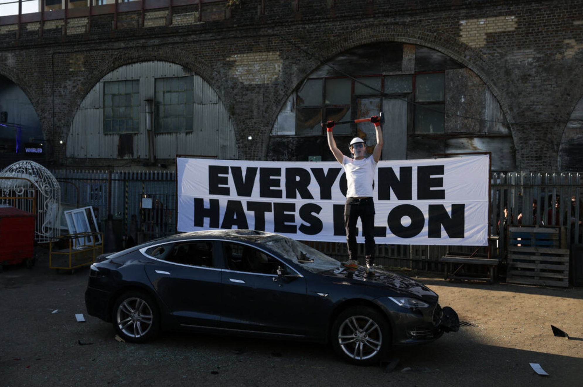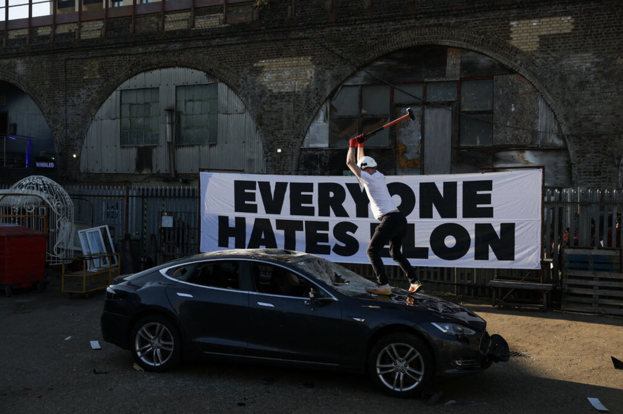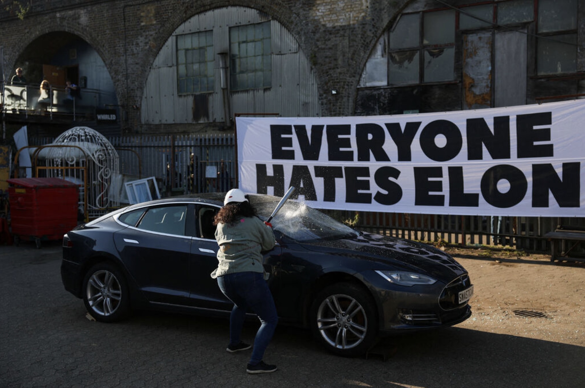 Ein persónur sorlar ein Tesla bil, sum ein dulnevndur hevur latið og ætlaður til upphøggingar undir einum stunti, sum bólkurin Everyone Hates Elon skipaði fyri, sum er partur av einum átaki í London 10. apríl 2025 ímóti at Elon Musk, stjóri í Tesla, er uppíblandaður í amerikonsku stjórnina.