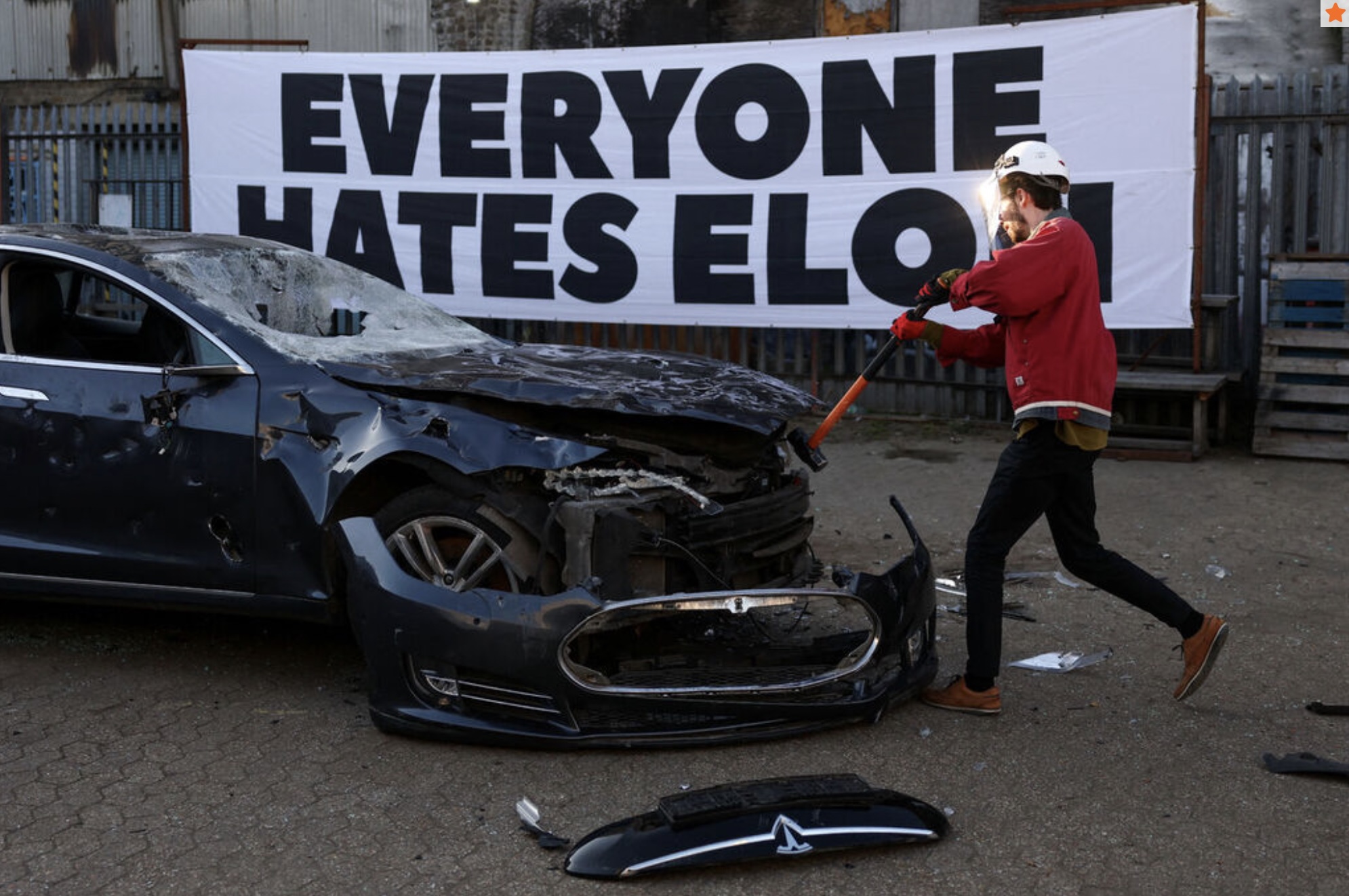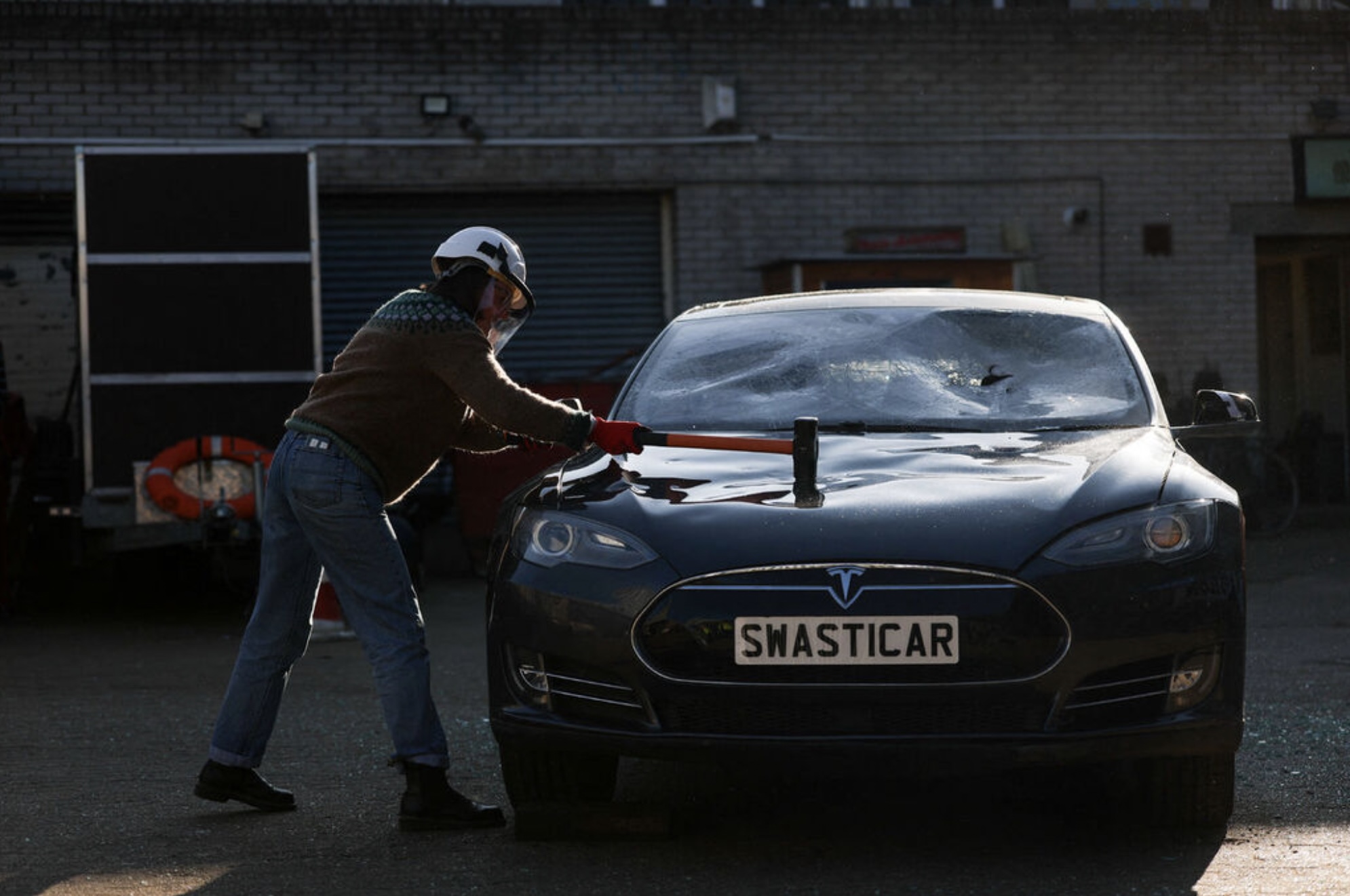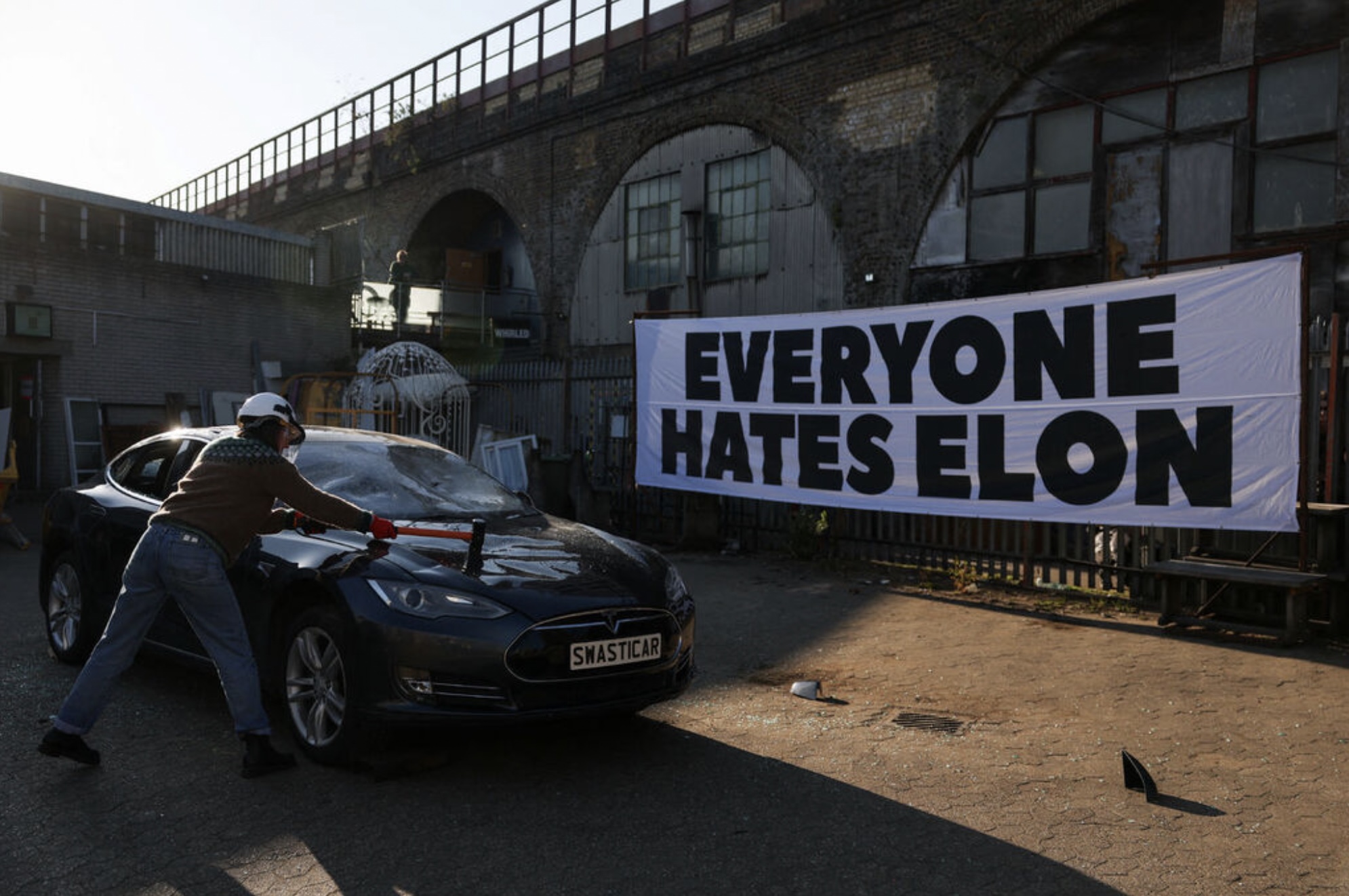 Ein persónur sorlar ein Tesla bil, sum ein dulnevndur hevur latið og ætlaður til upphøggingar undir einum stunti, sum bólkurin Everyone Hates Elon skipaði fyri, sum er partur av einum átaki í London 10. apríl 2025 ímóti at Elon Musk, stjóri í Tesla, er uppíblandaður í amerikonsku stjórnina.