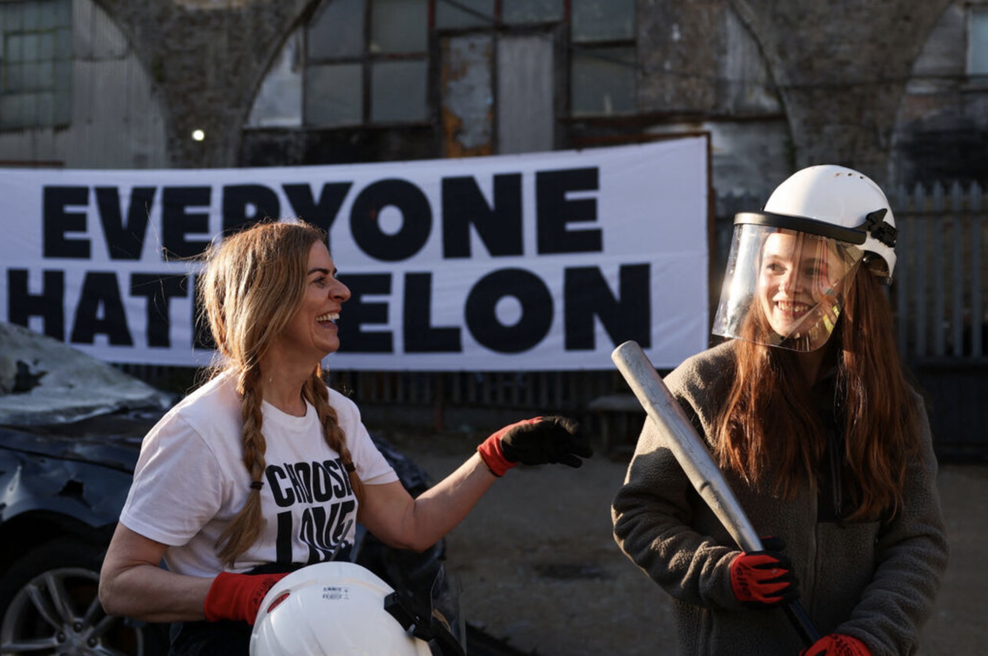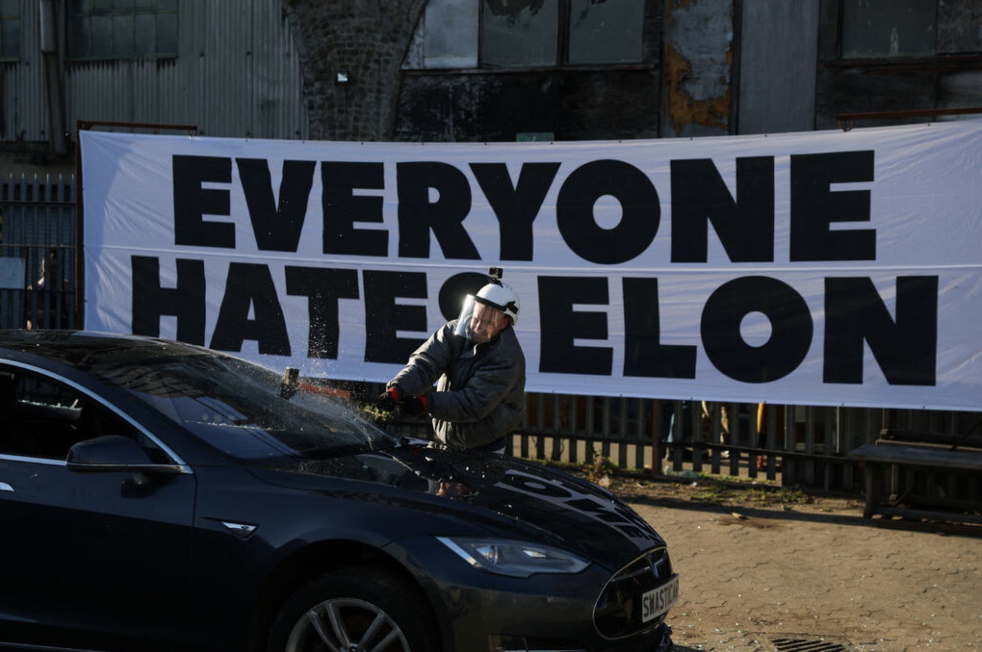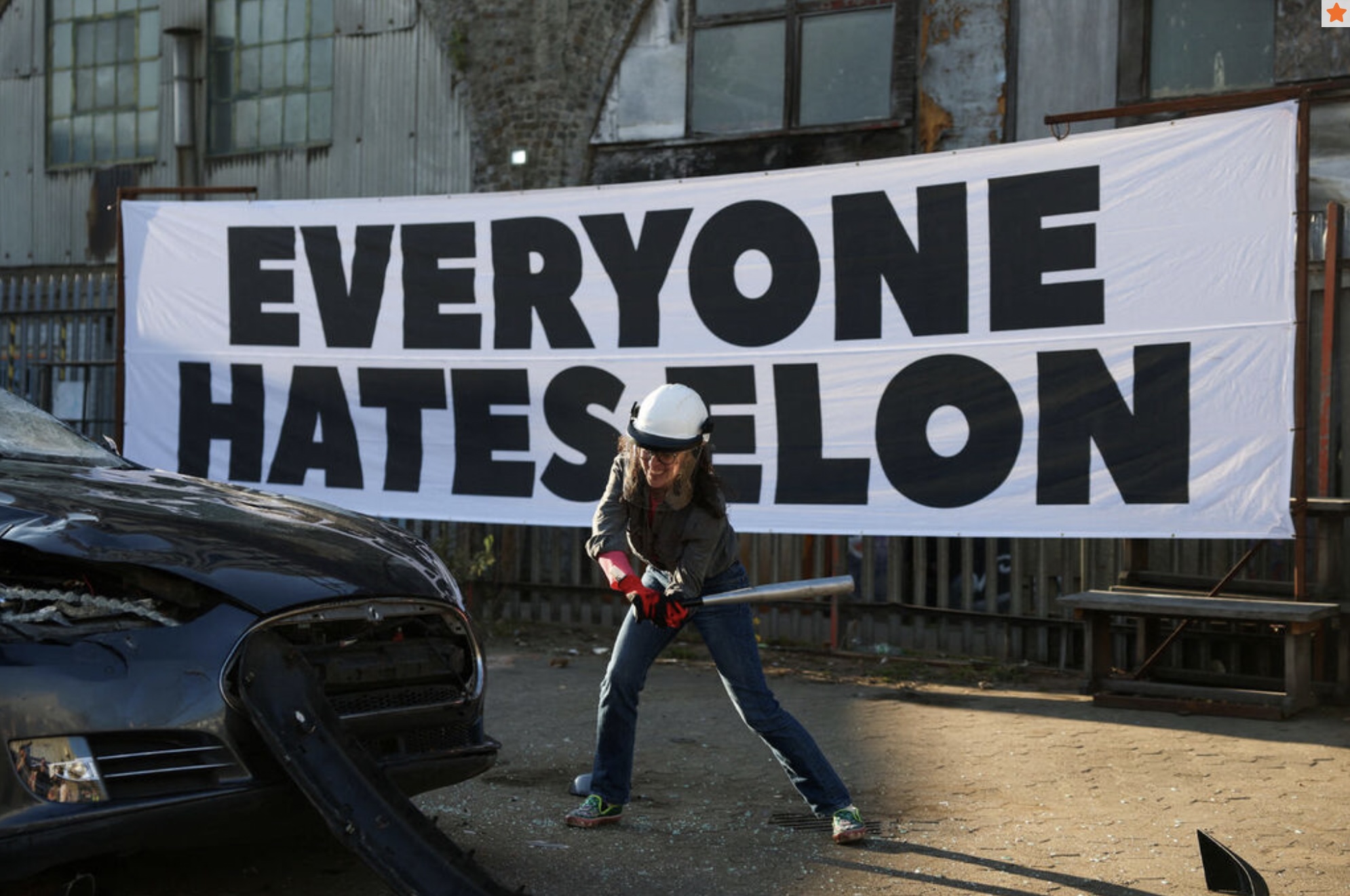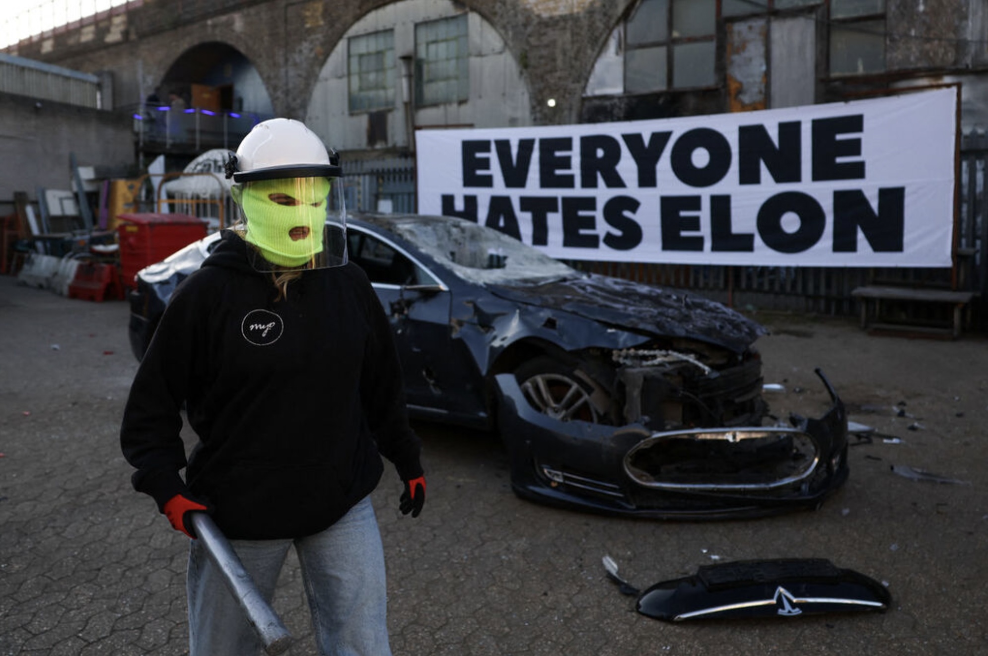 Ein persónur sorlar ein Tesla bil, sum ein dulnevndur hevur latið og ætlaður til upphøggingar undir einum stunti, sum bólkurin Everyone Hates Elon skipaði fyri, sum er partur av einum átaki í London 10. apríl 2025 ímóti at Elon Musk, stjóri í Tesla, er uppíblandaður í amerikonsku stjórnina.