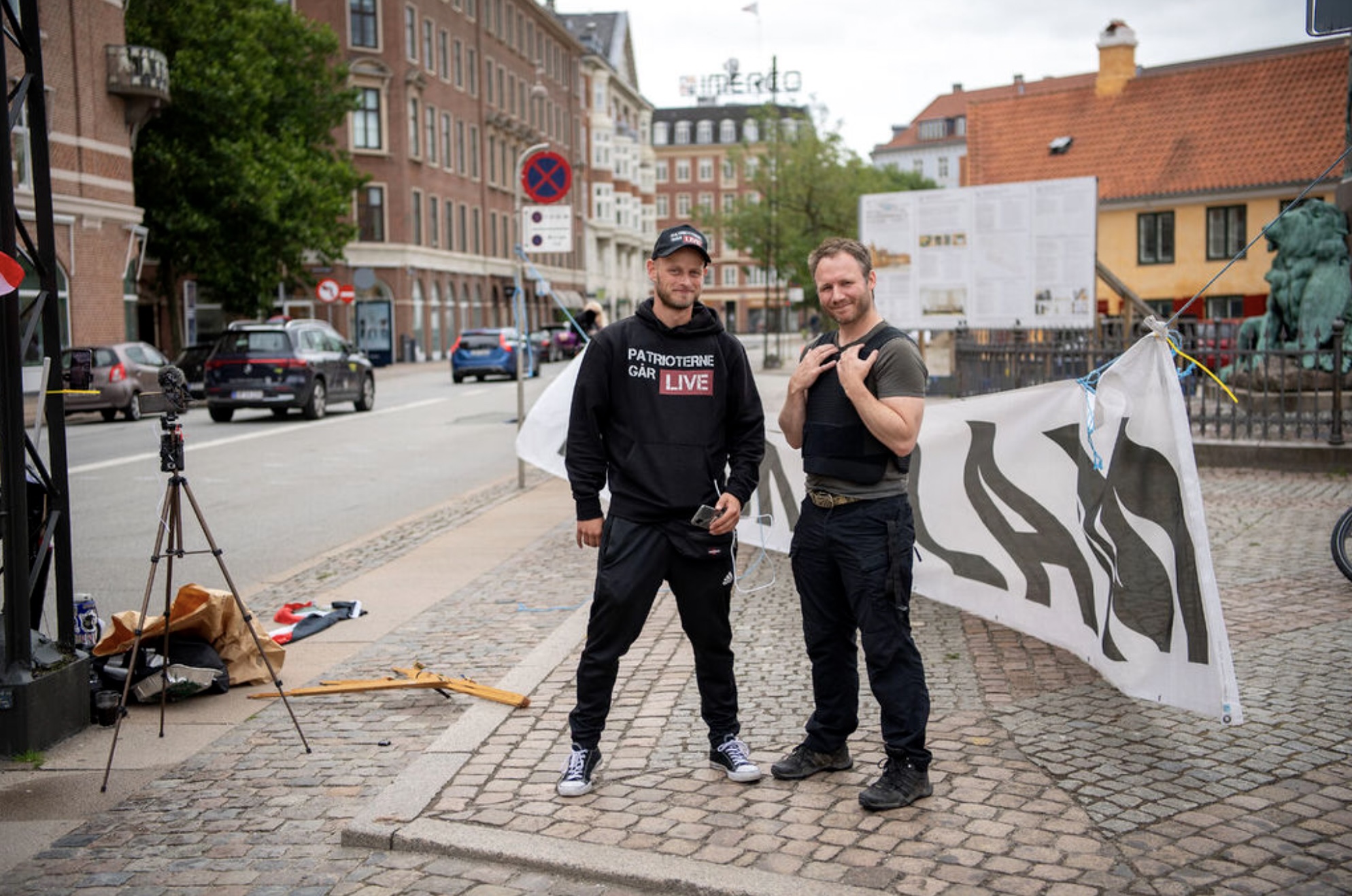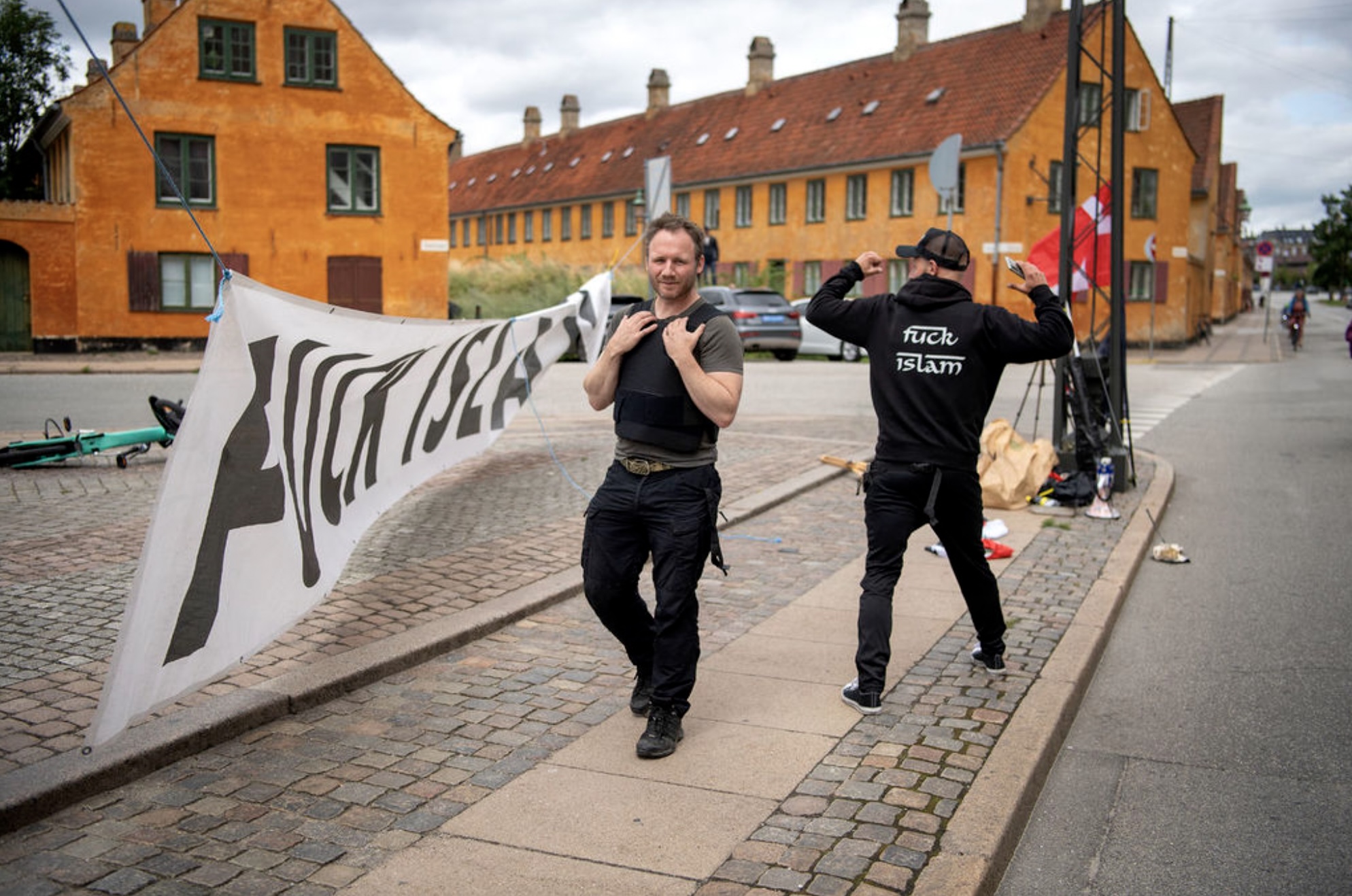 Annar maðurin er ílætin skottryggan vest, meðan hin er í eini svartari hettutroyggju, har tað stendur »fuck islam«.