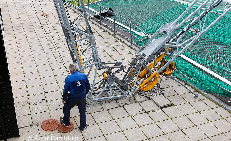 Kranin koppaði beint niður á bygningin hjá grannskoðaravirkinum Januar, meðan kranin varð reistur.