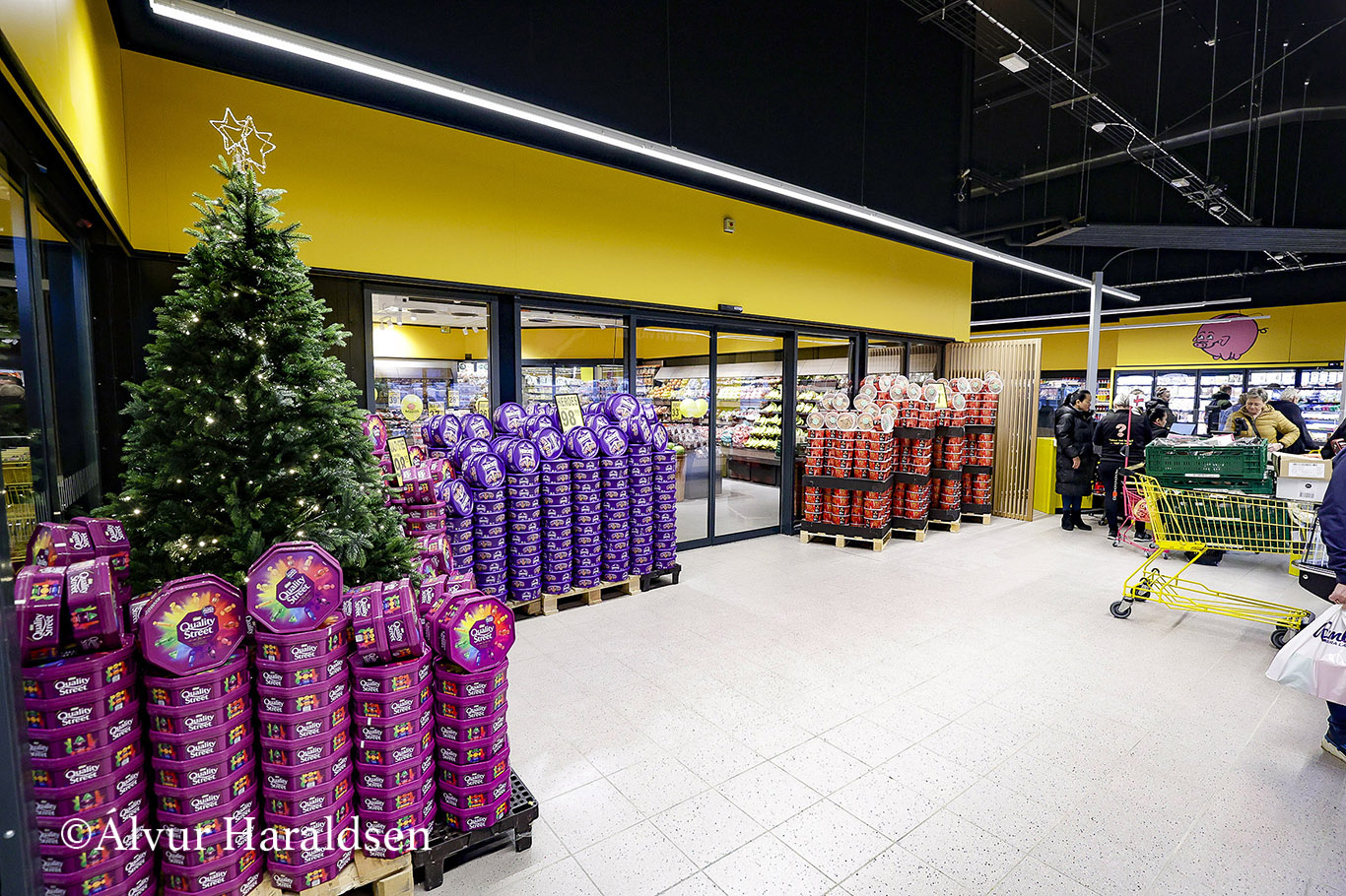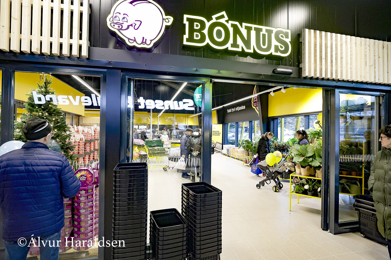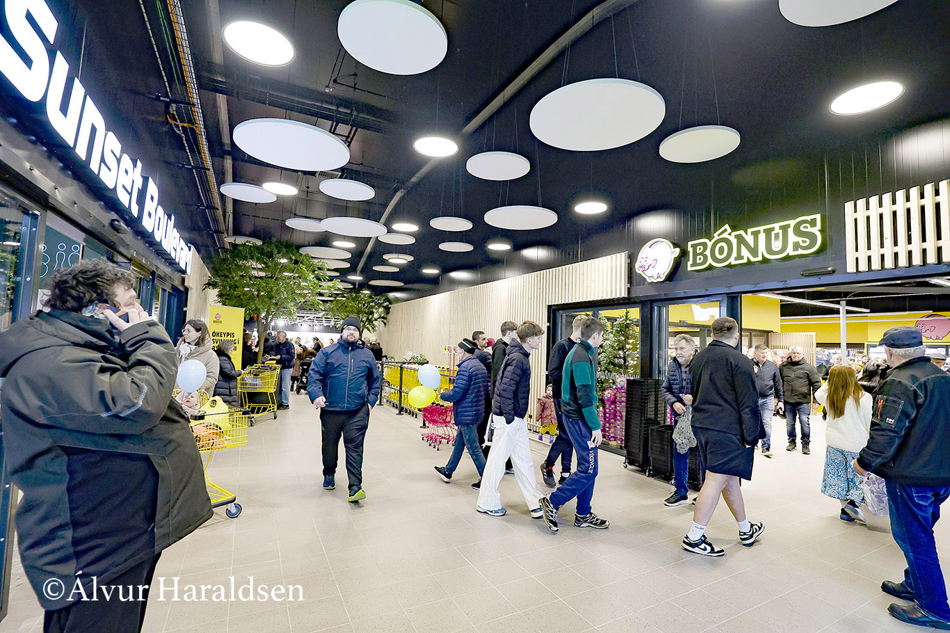 Handilsbygningurin Bryggjan í Runavík latin upp í dag. í bygninginum eru Bónus, Rumbul, Skálkur og Sunset.