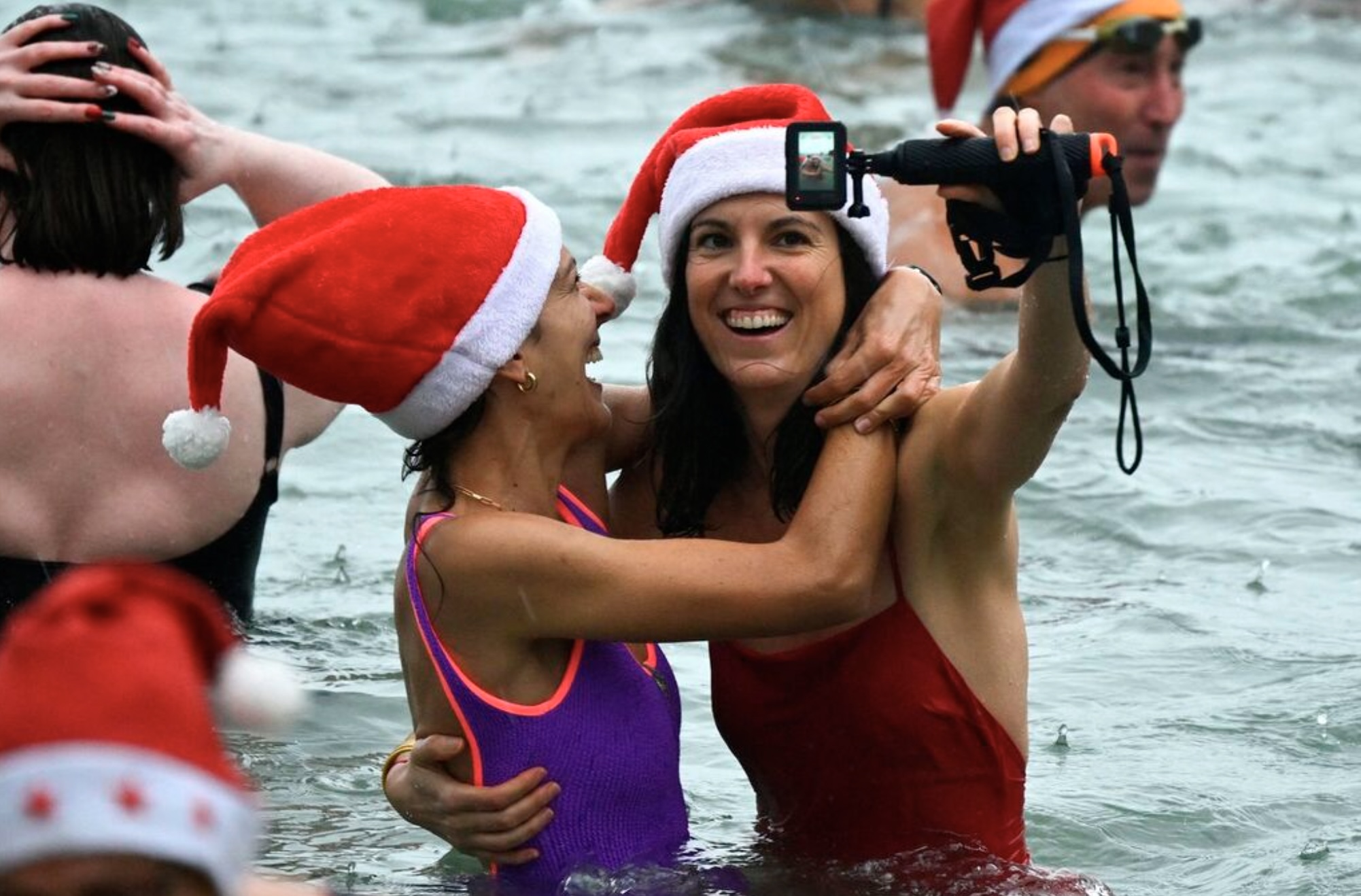 Baðarar luttaka í siðbundnu jólasvimjingini á Port Vieux strondini í Biarritz í landsynnings Fraklandi, 21. desember 2025. Siðbundna svimjingin hevur verið skipað síðani 1929 av felagnum "Les Ours blancs", sum merkir 'ísbjørn' á fronskum.