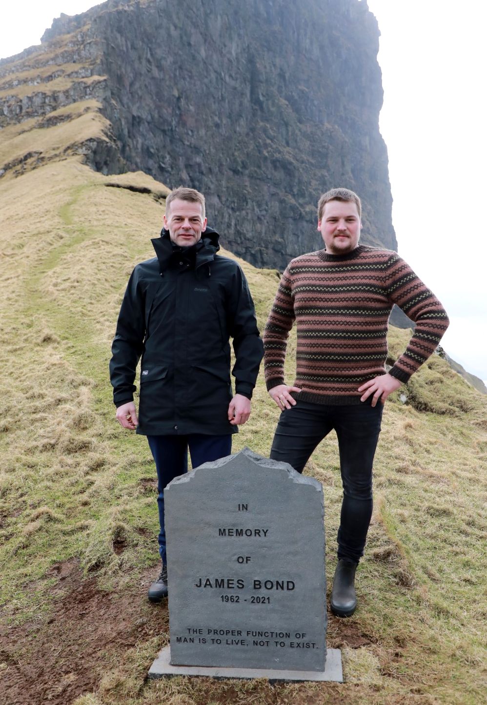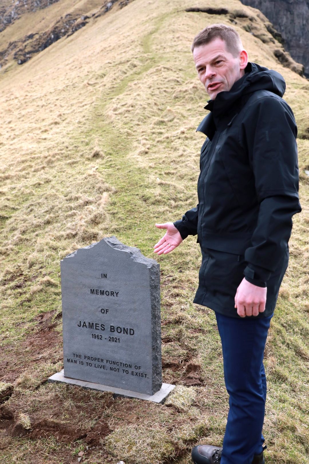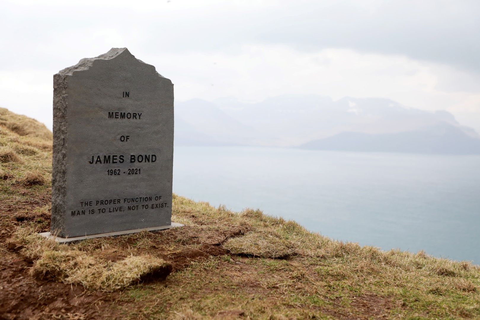 Í hesum sambandi er nú reistur ein gravsteinur úti í Kallinum við áskriftini »In memory of James Bond 2062-2021. The proper function of man is to liv, not to exist«.