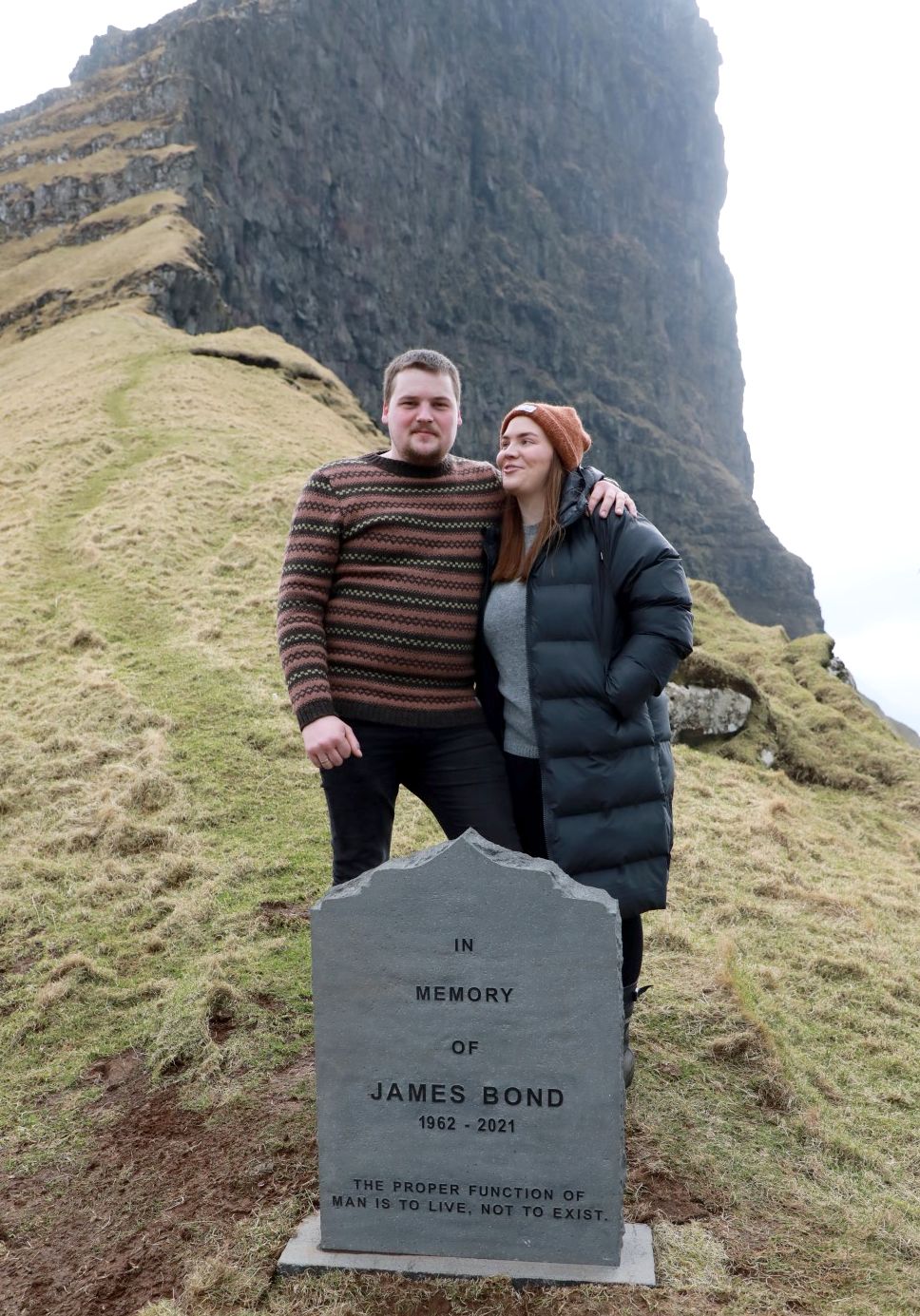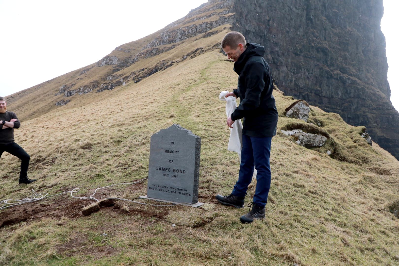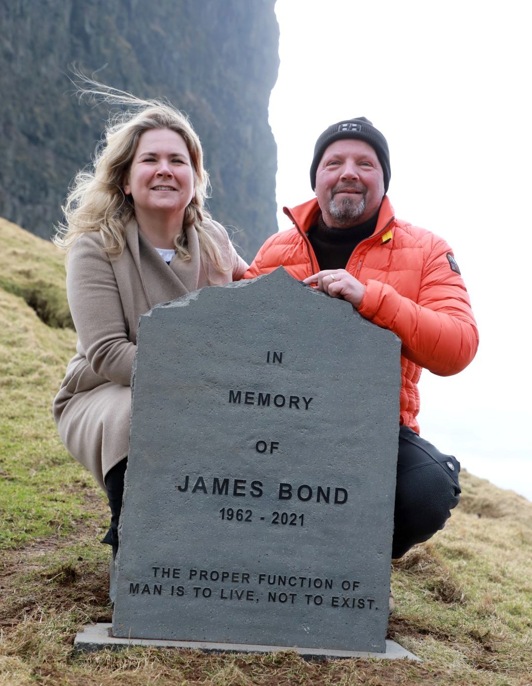 Í hesum sambandi er nú reistur ein gravsteinur úti í Kallinum við áskriftini »In memory of James Bond 2062-2021. The proper function of man is to liv, not to exist«.