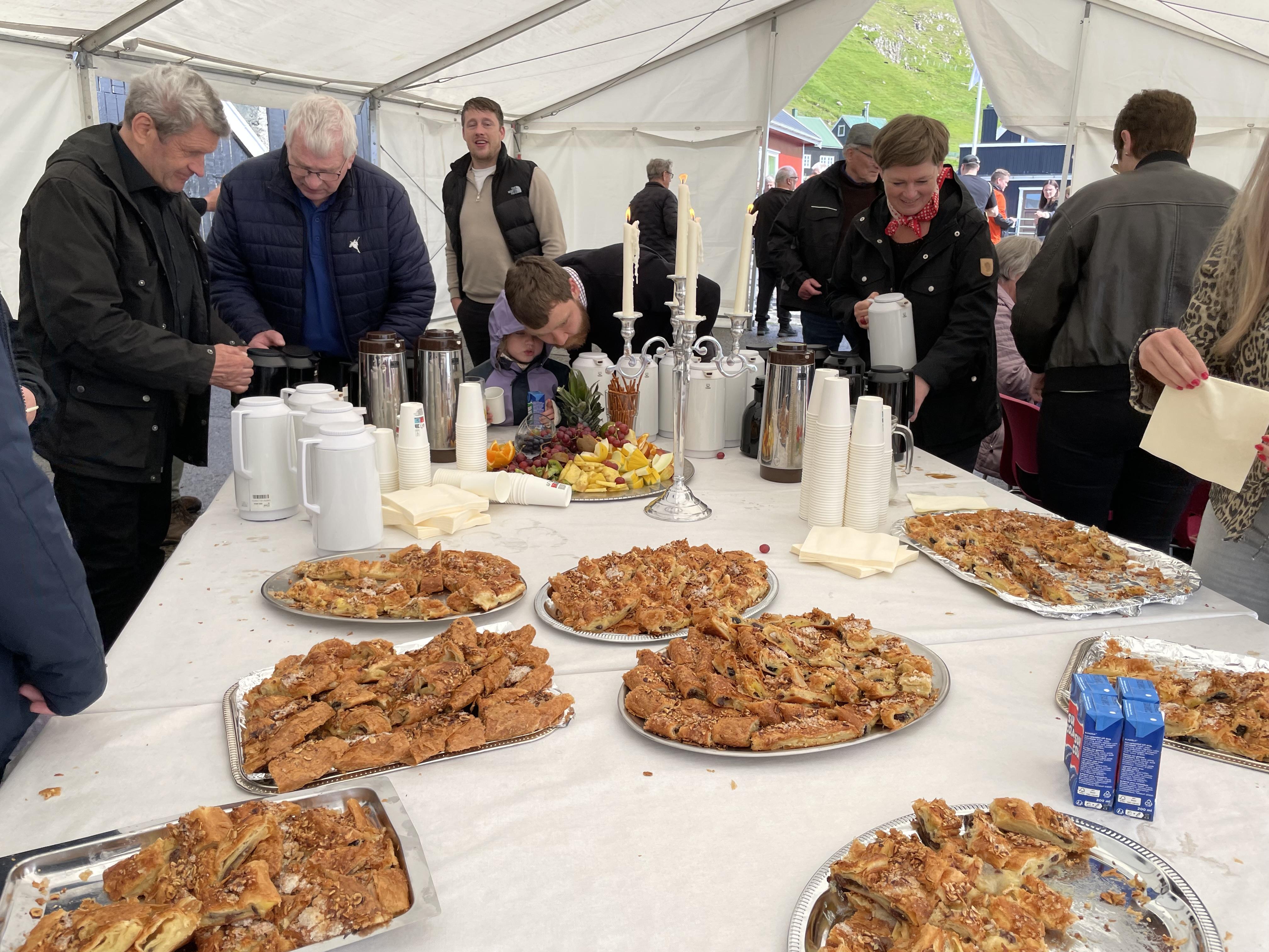 Eftir hetta gekk leiðin oman í bygdina, har kaffi og køkur vóru at fáa í tjaldinum, men tey flestu valdu at fara útum, tí sólan sá av bláum himli.