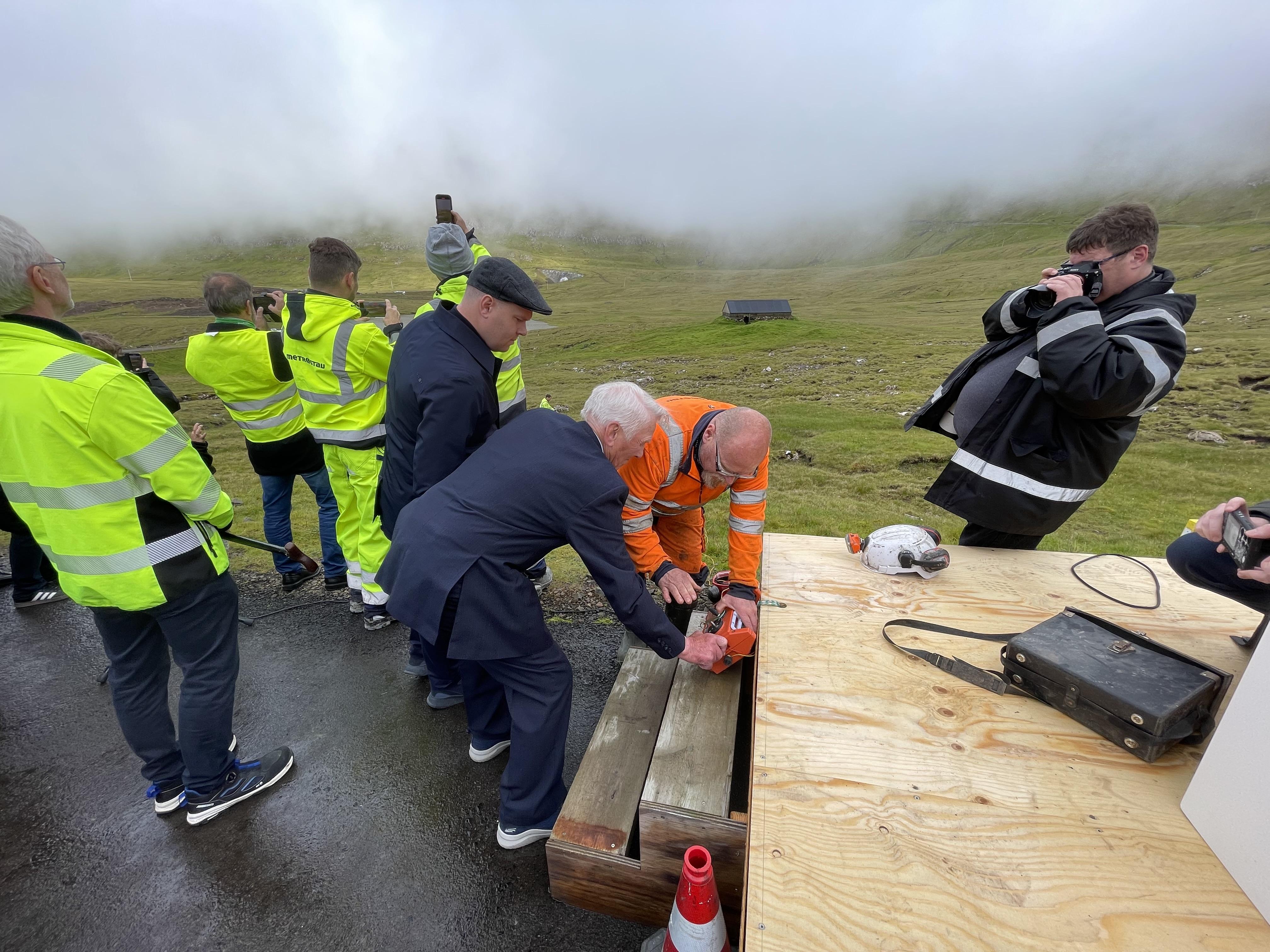 Síðani kom stóra løtan, har elsti borgari í Fámjin, 89 ára gamli Svend Joensen, trýsti á knøttin, og so hoyrdist seinasta skot í Fámjinstunlinum, og roykur sást við tunnilsmunnan.