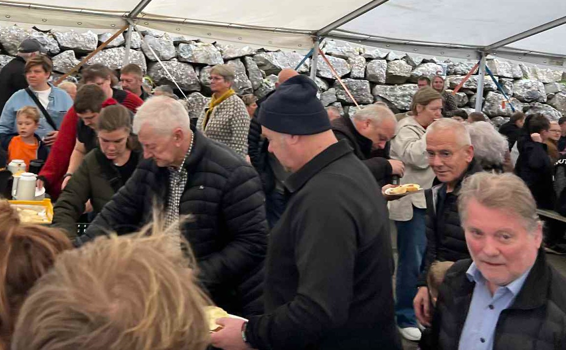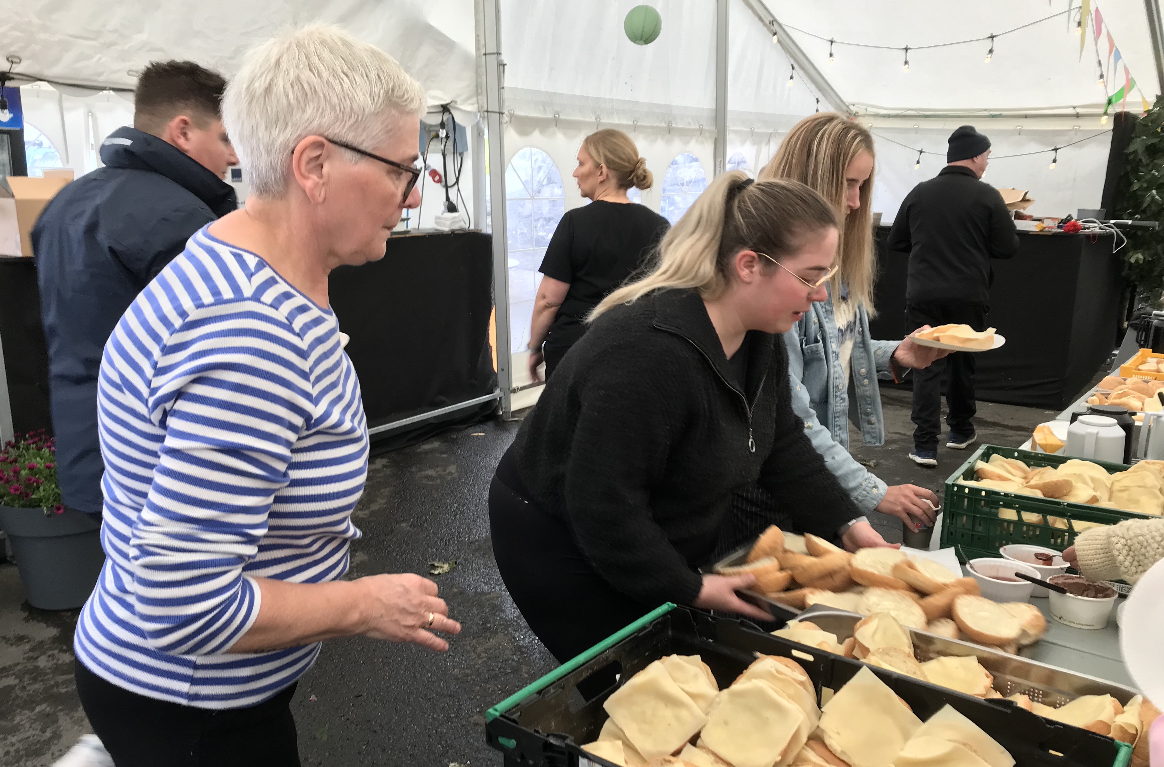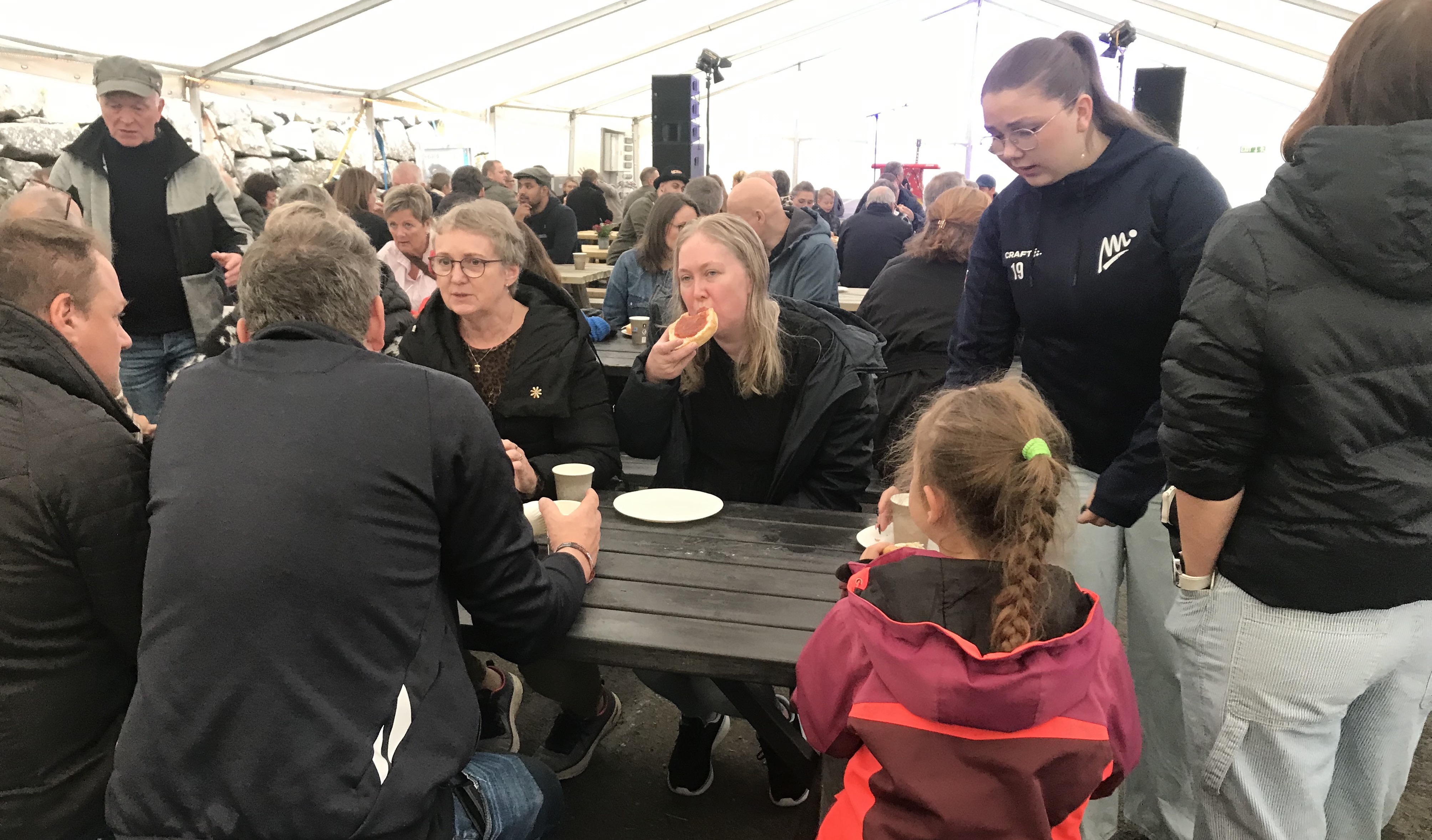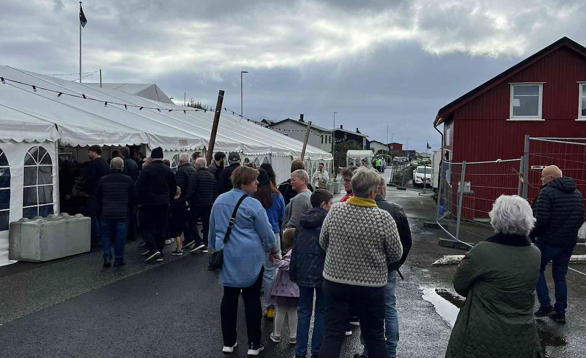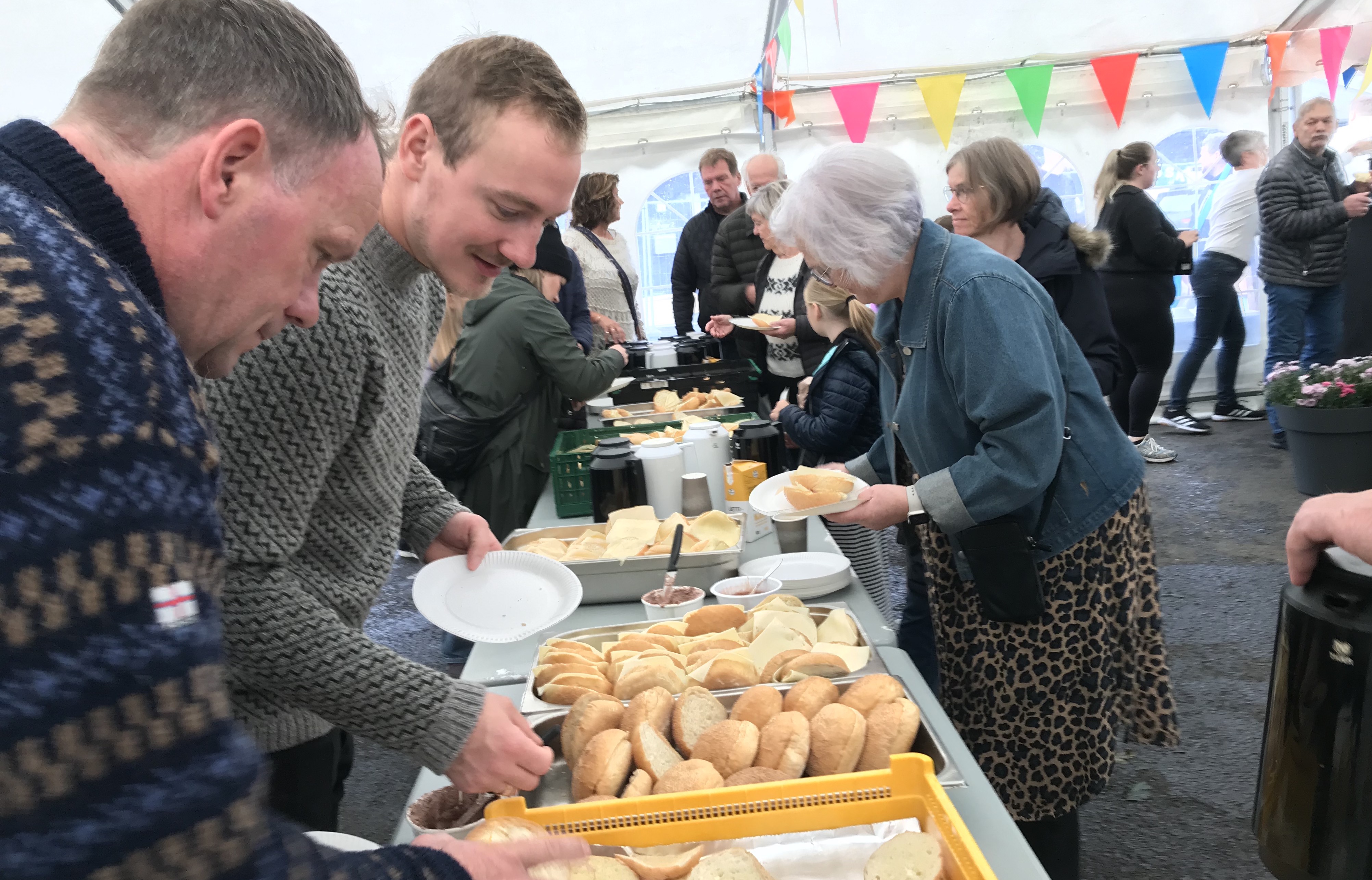 Eina løtu í morgun var bíðirøð at sleppa inn í tjaldið, tá stóra og ókeypis morgunmatarborðið á Norð Festivalinum á Viðareiði læt upp.