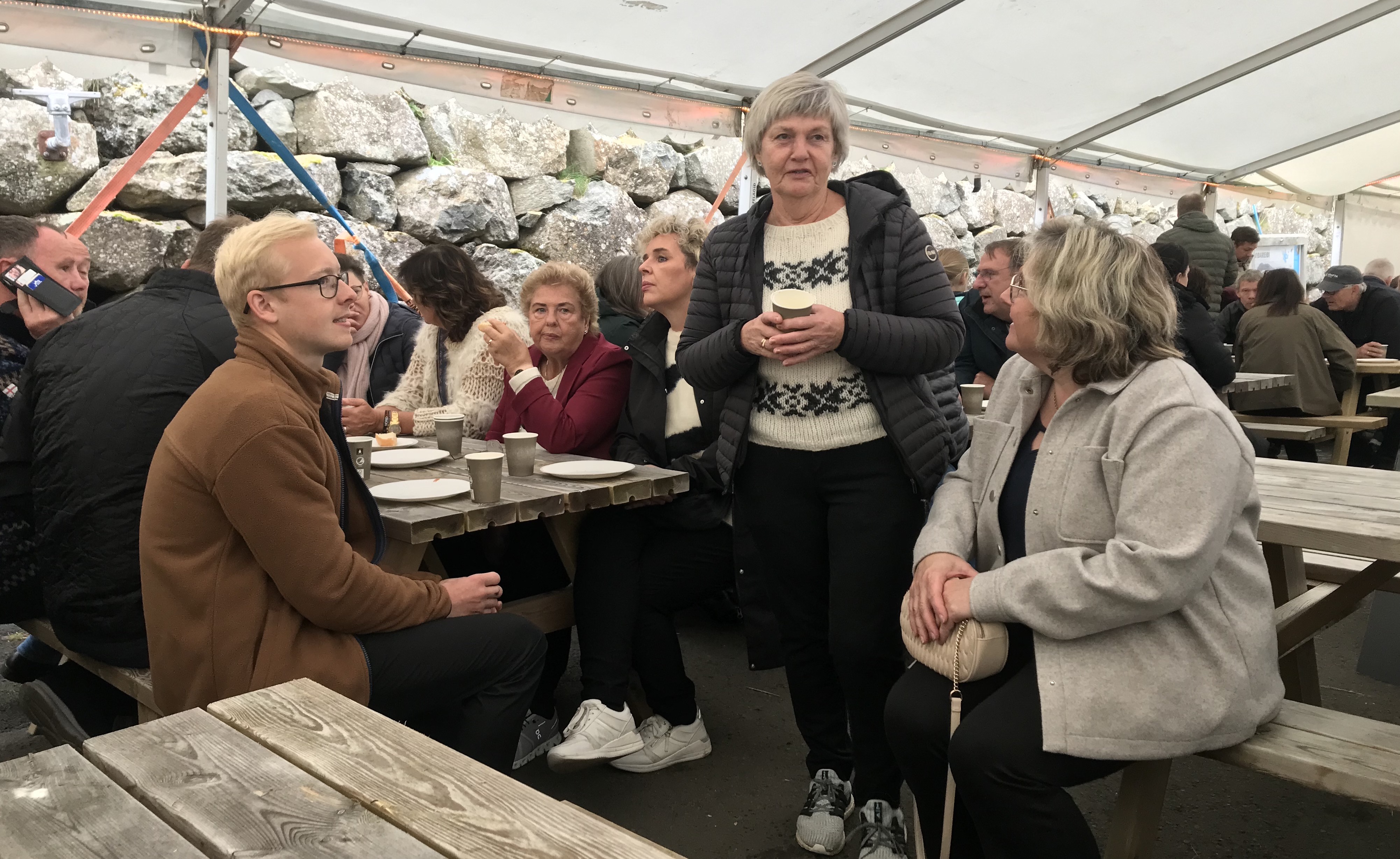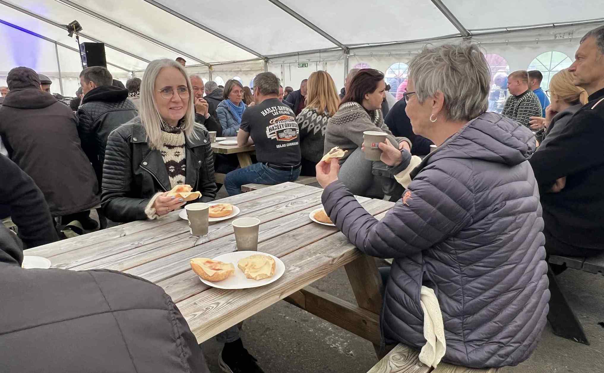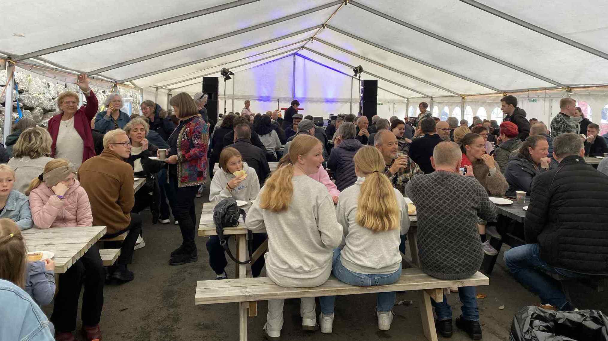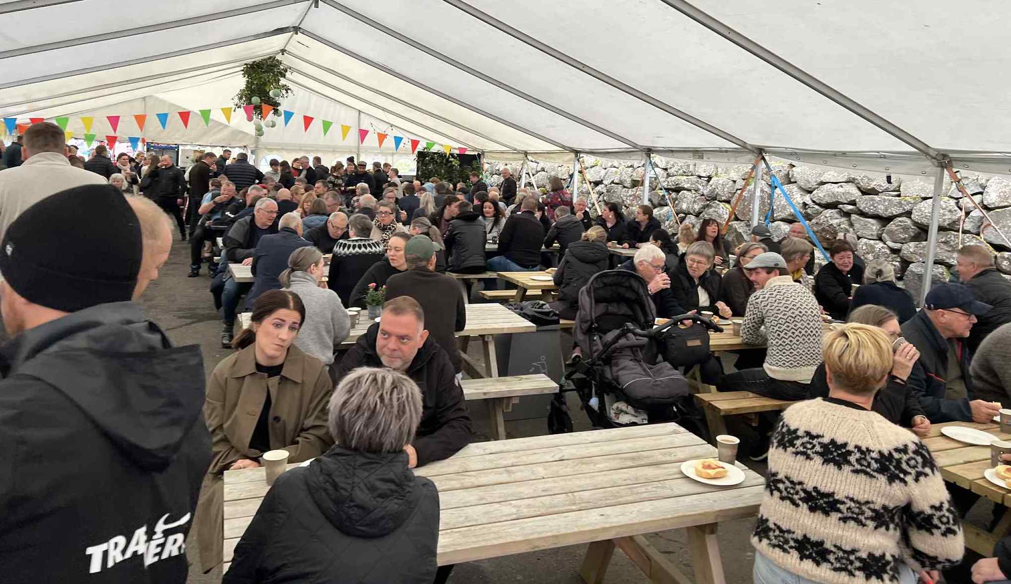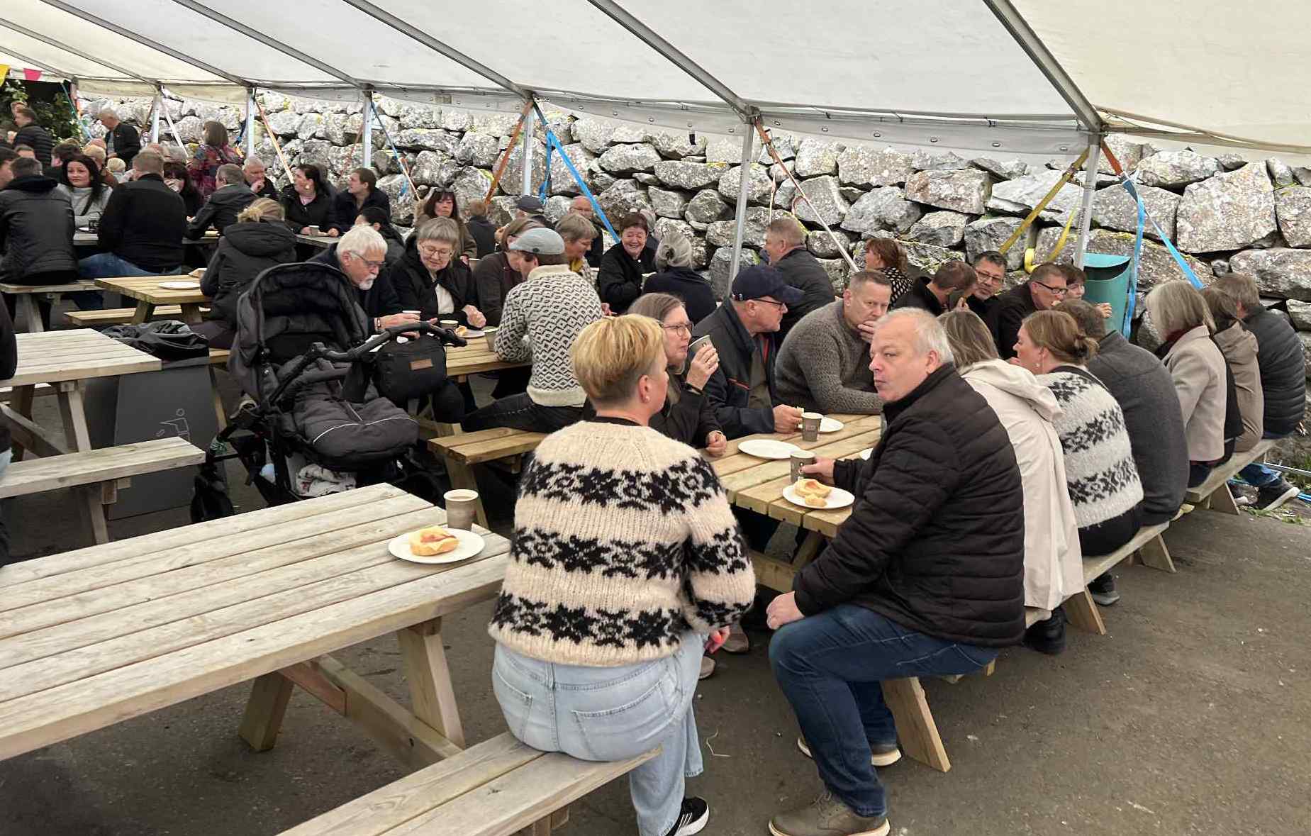 Í tjaldinum var skipað so fyri, at her vóru nógv sitipláss og tey, sum ikki fingu pláss at sita í tjaldinum, sótu uttanfyri í góðveðrinum.