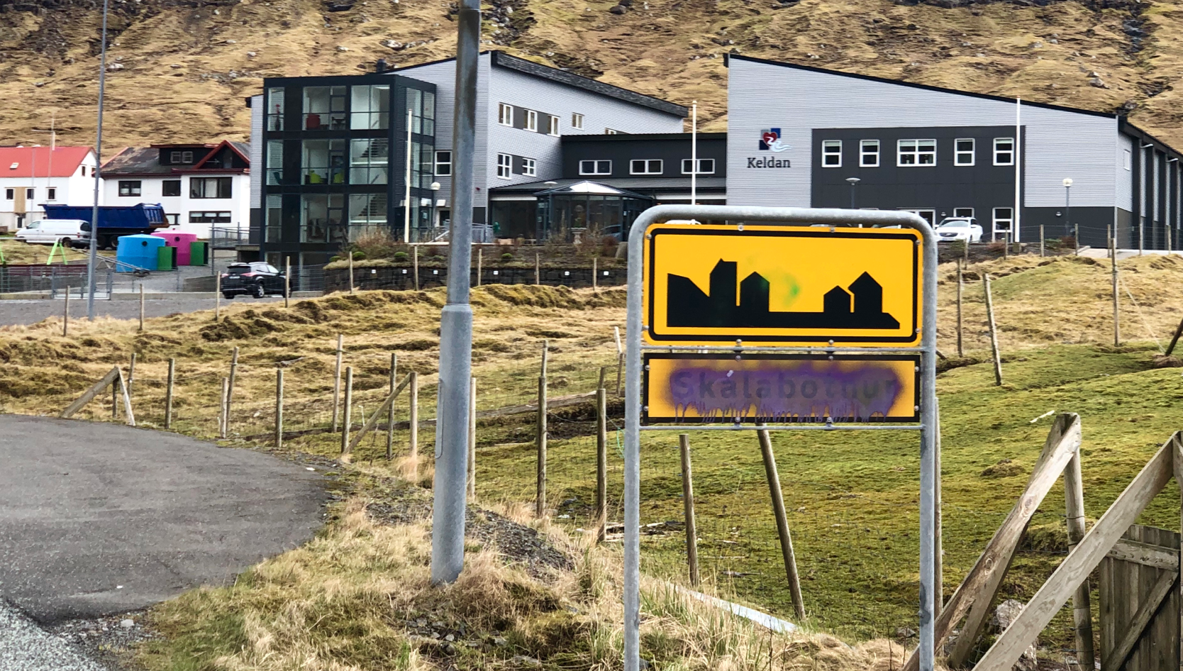 Nú er navnið Skálabotnur strikað – í øllum førum á báðum bygdaskeltunum við innkoyringarnar til bygdina.