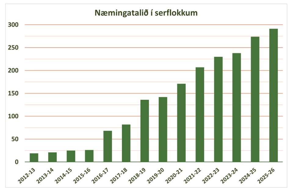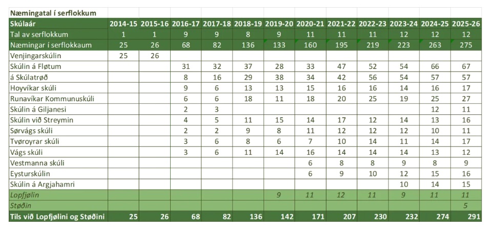 Fyri 10 árum síðan vóru 68 næmingar í serflokkunum, fyri fimm árum síðan 160 næmingar, og hetta skúlaárið eru 275 næmingar í serflokkunum. Tað vil siga, at seinastu fimm árini eru 115 næmingar fleiri í serflokkunum; samanbera vit við fyri 10 árum síðan, so er tað ein fýrafalding av næmingatalinum í serflokkunum. Sjálvt um talið av næmingum í serflokkum er nógv vaksið, so er enn long bíðitíð eftir at fáa pláss í einum serflokki.